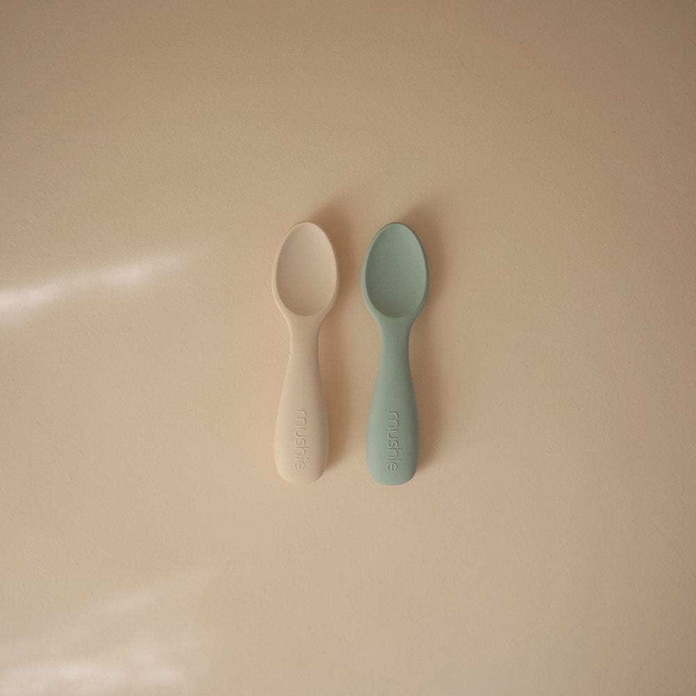 Startskedar för spädbarn, 2-pack, Cambridge Blue/Shifting Sand från Mushie.