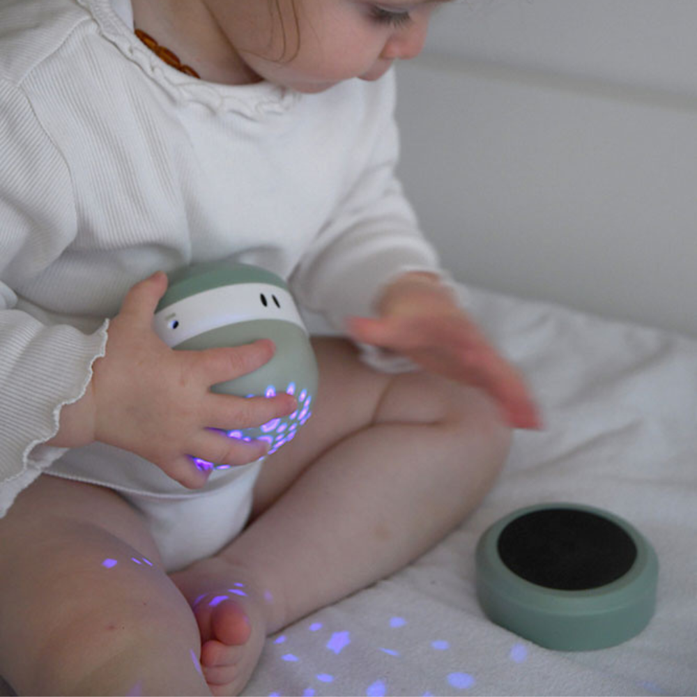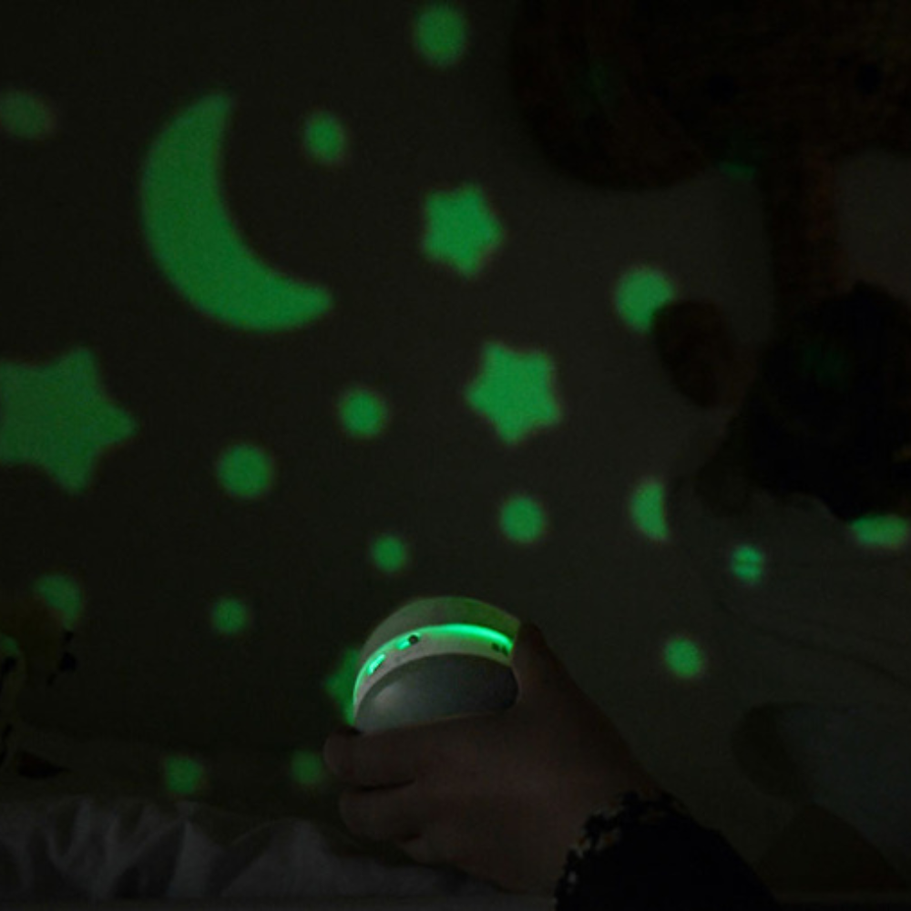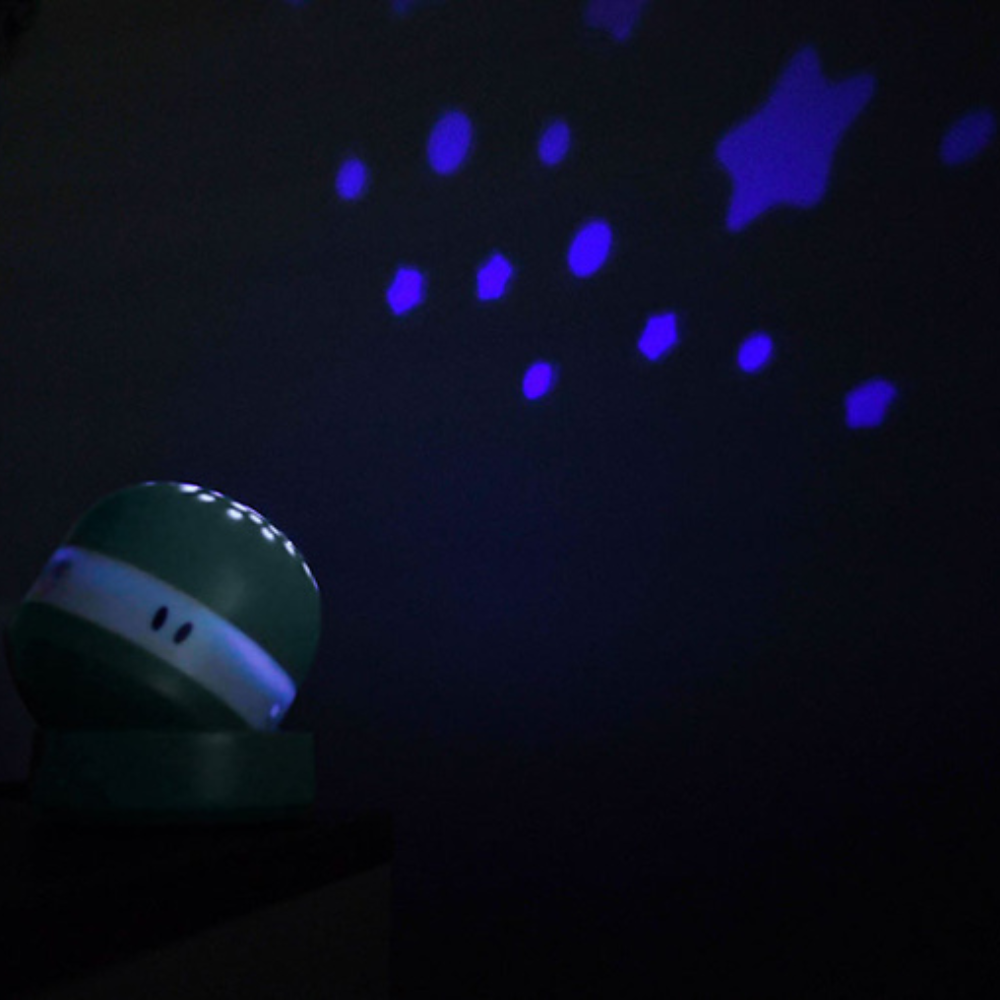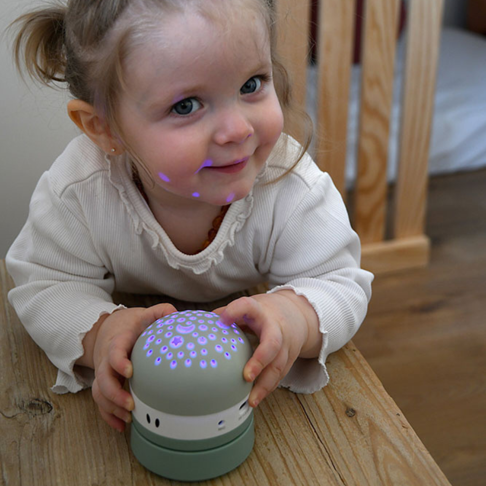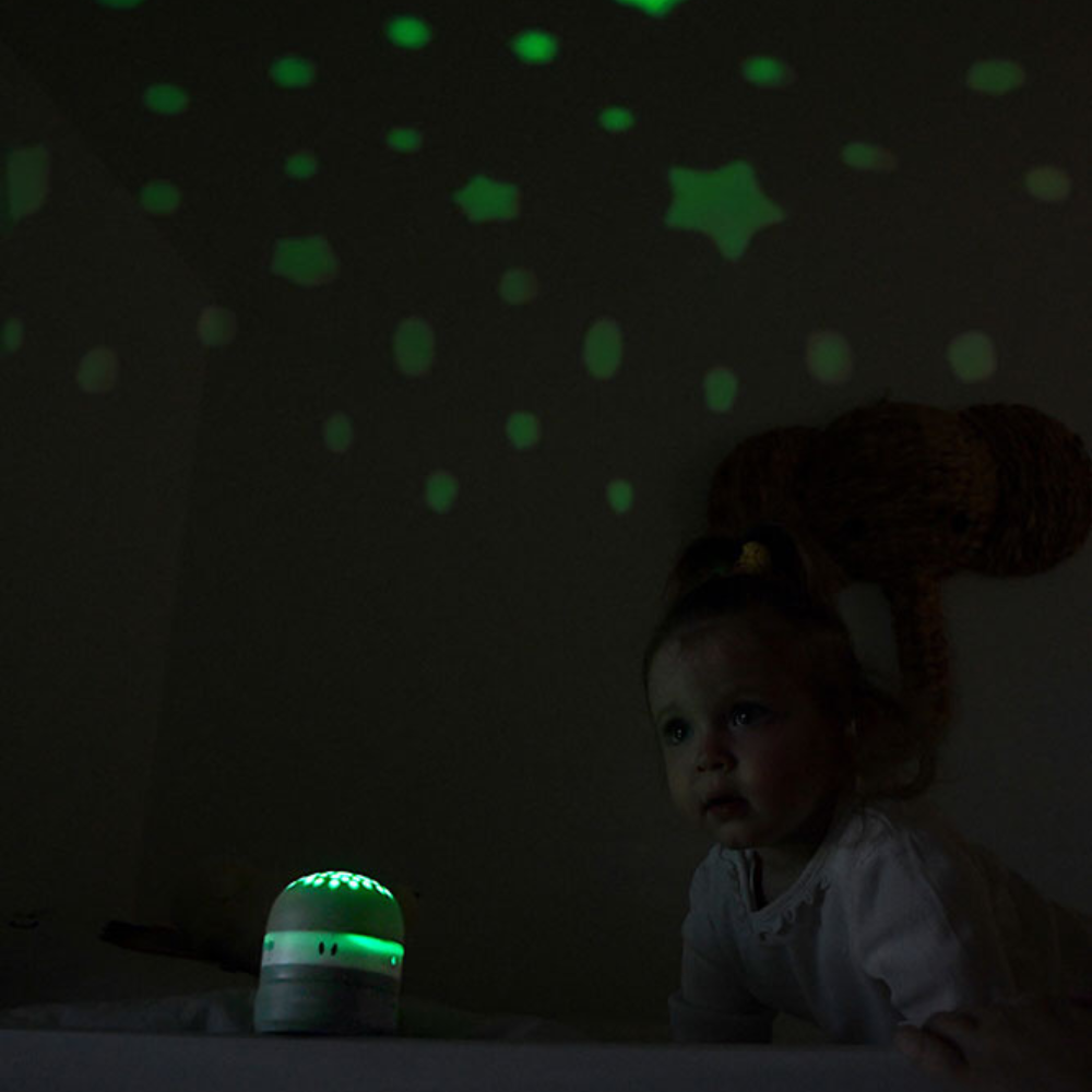 Denna kompakta projektor hjälper ditt barn att lugna ner sig före sänggåendet genom att omge det med en mjuk stjärnhimmel och lugnande ljud.