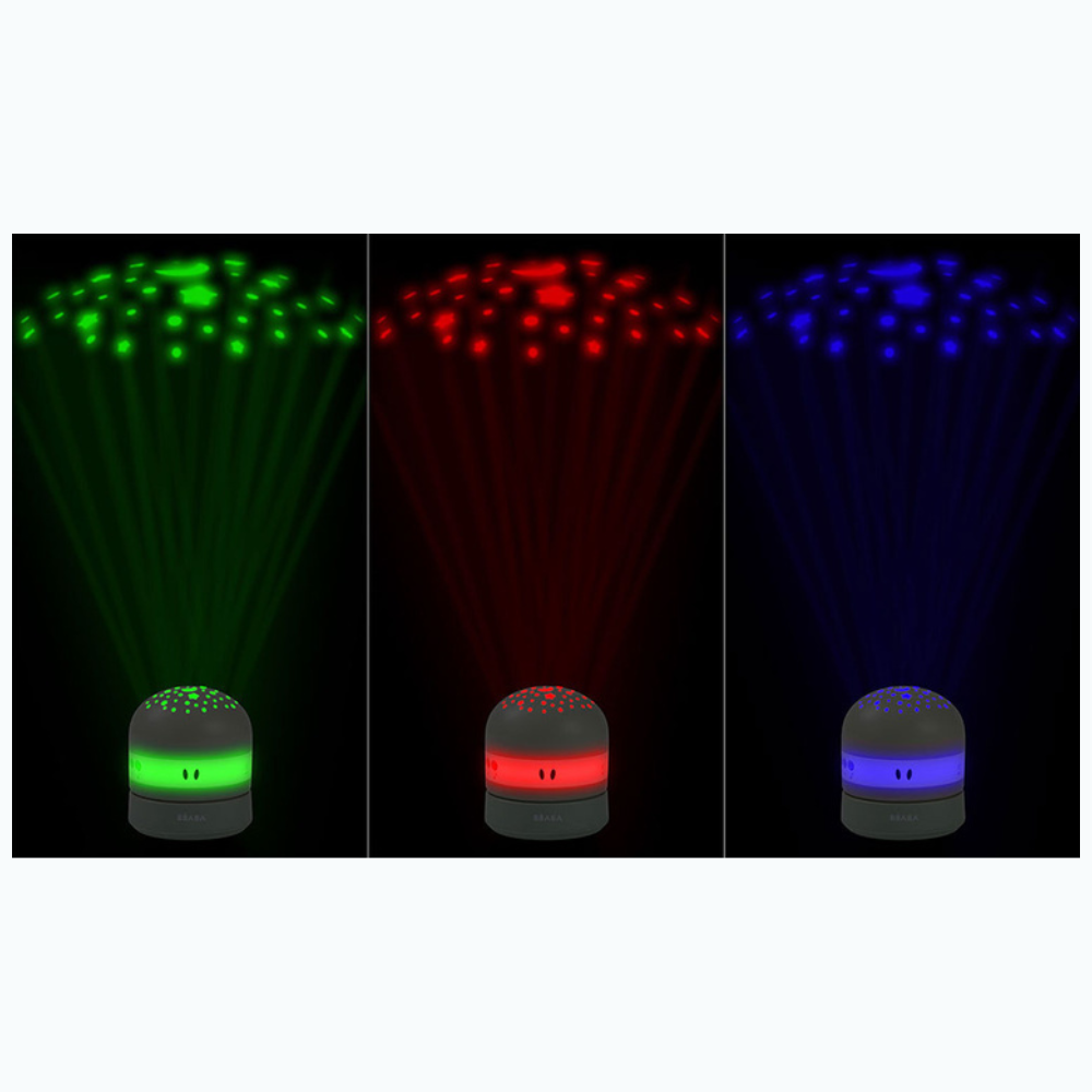 Beaba-enheten projicerar stjärnor i tre färger – rött, grönt och blått – med val mellan fast, skiftande eller slumpmässigt ljus. Den justerbara projektionsvinkeln gör att du kan rikta bilden mot taket, väggen eller en plats efter eget val – precis där ditt barn gillar att titta innan läggdags.