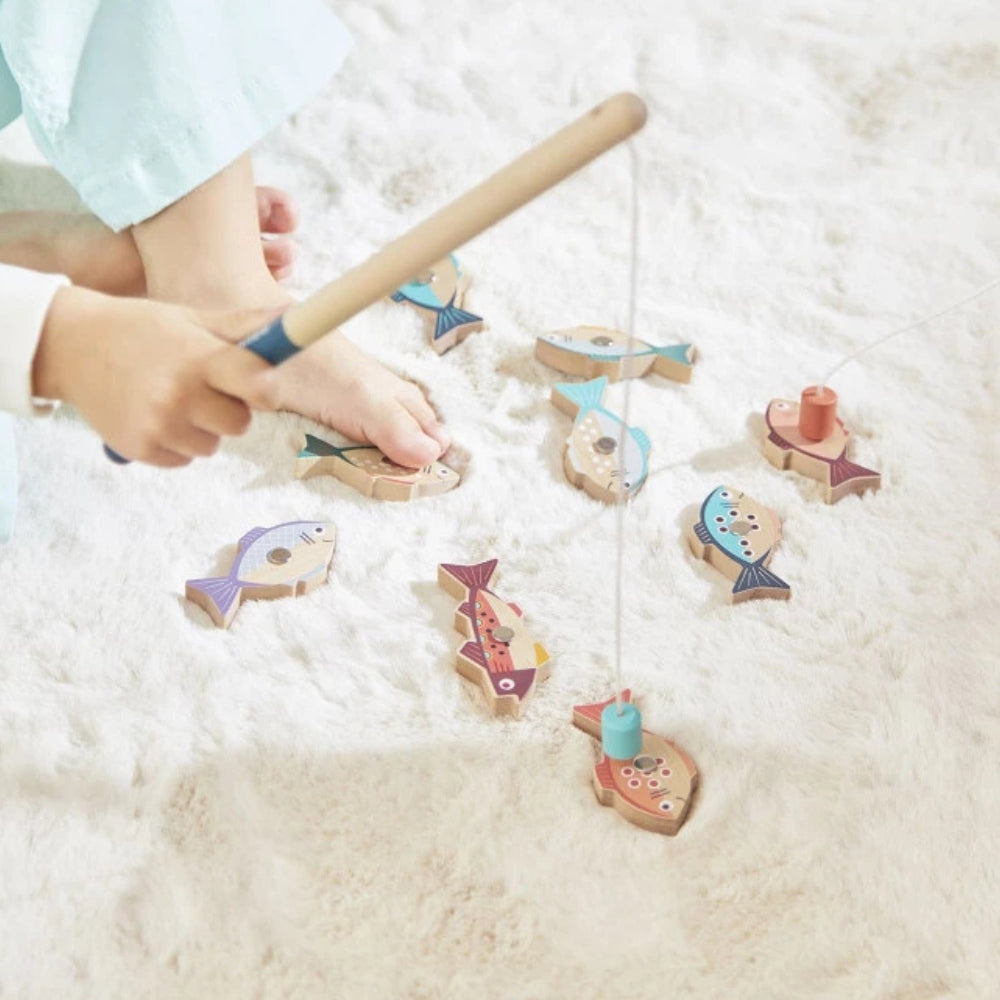 Mit zwei hölzernen Angelruten mit Magnet kann Ihr Kind bunte Fische fangen und dabei einen festen Griff und präzise Bewegungen üben.