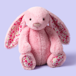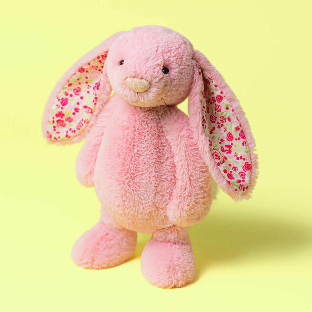 Das Blushkin Blossom Luxe Bunny Kuscheltier von Jellycat ist ein bezauberndes rosa Häschen mit geblümten Ohren, das sofort zum Kuscheln animiert.