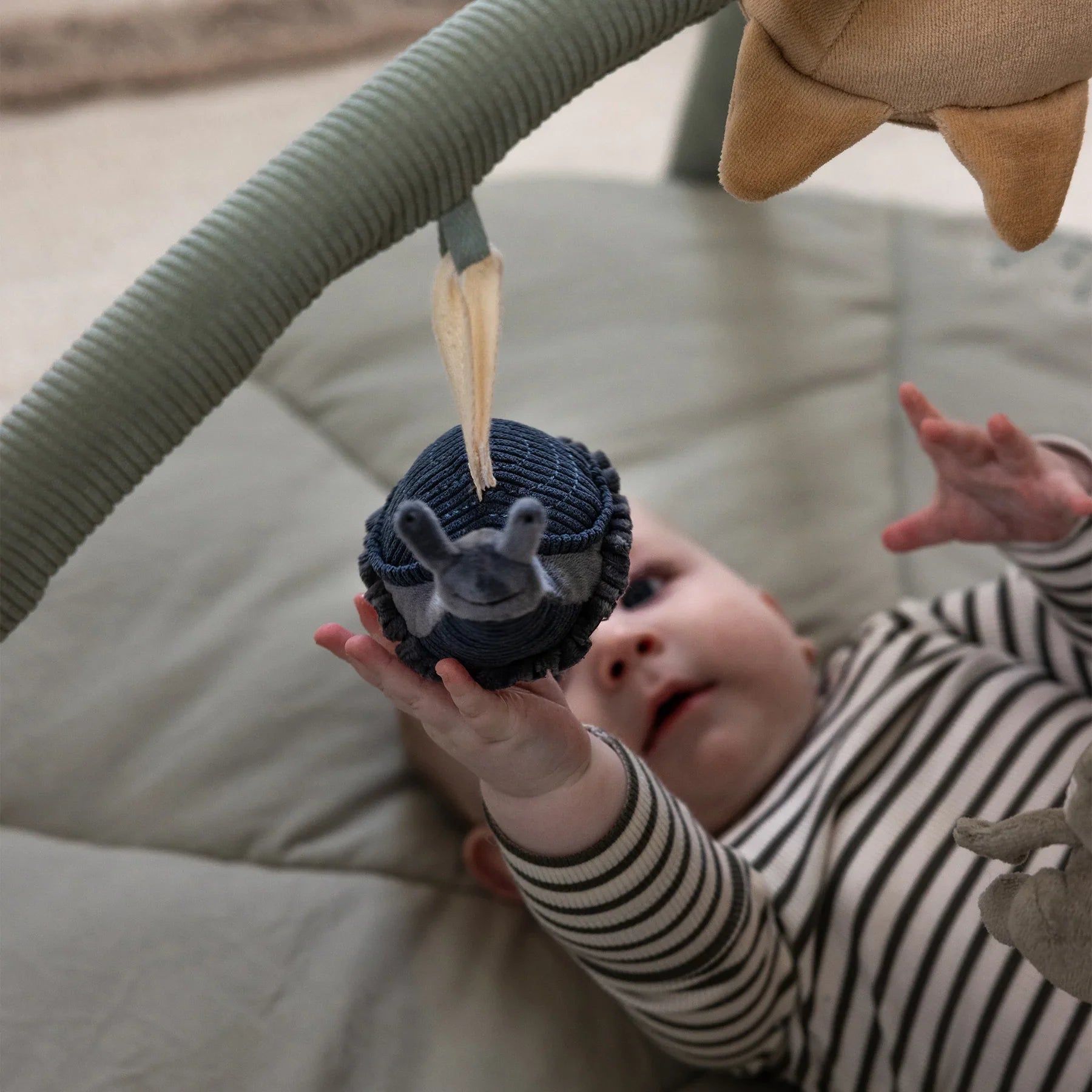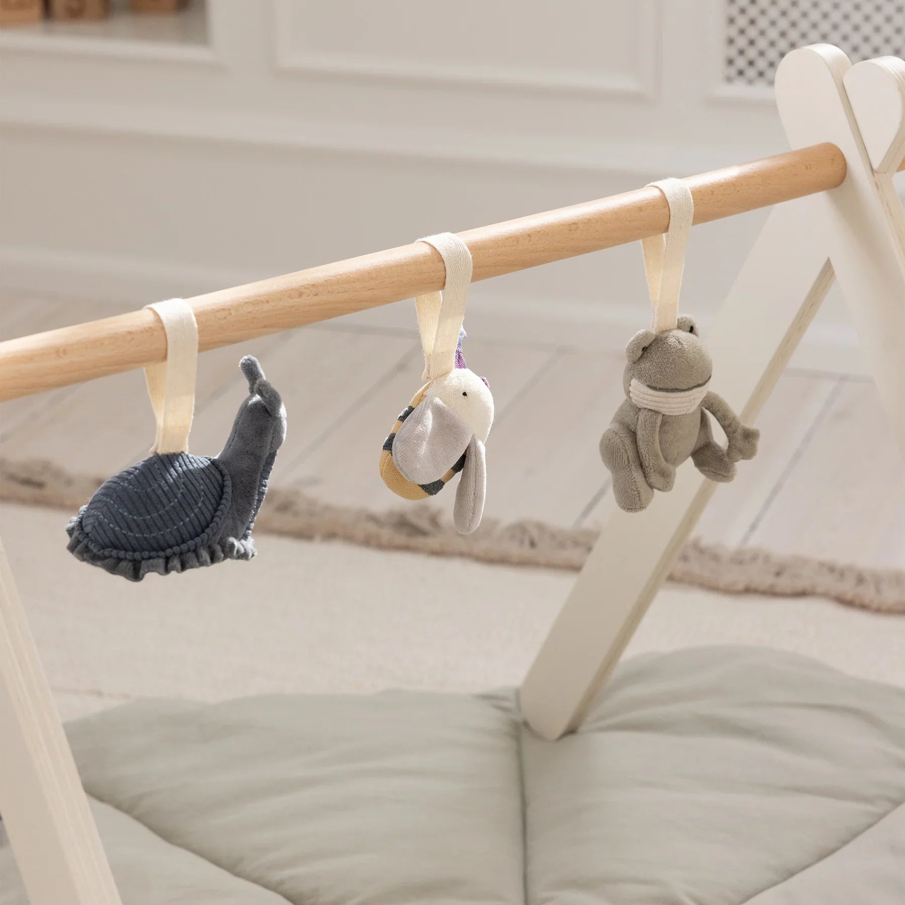 Jedes Spielzeug verfügt über praktische Bänder zur einfachen Befestigung am Kinderwagen, Autositz oder an der Spielmatte.