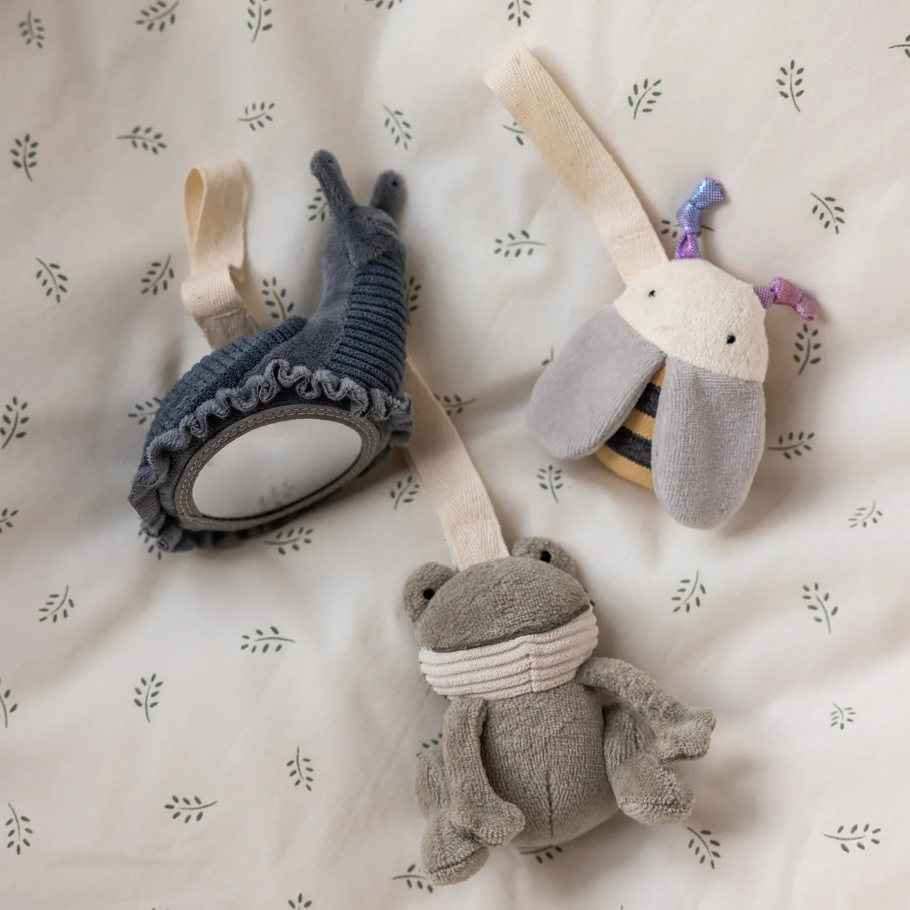 Das Set enthält einen Frosch mit Quietschgeräuschen, eine Biene mit Rassel und eine Schnecke mit einem babysicheren Spiegel.