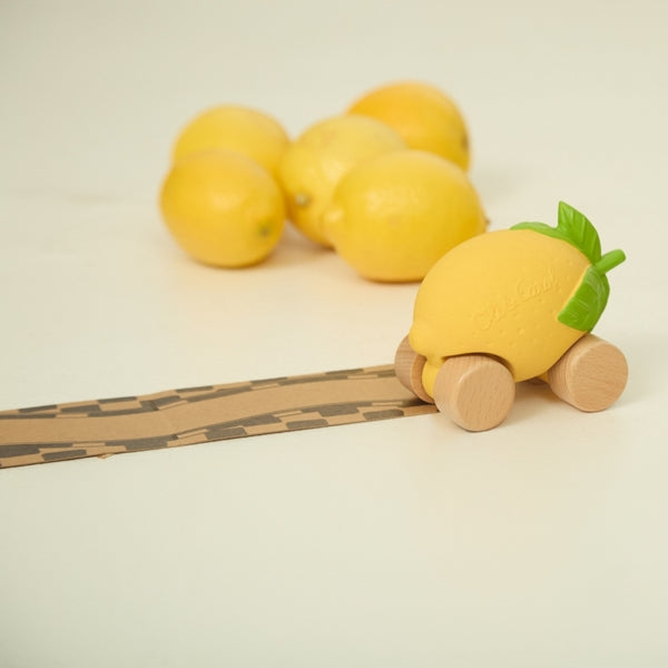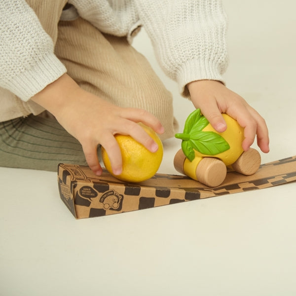 Lemon Lou babyauto och bitring i ett Lemon Lou från Oli &, Carol är miljövänligt och roligt.