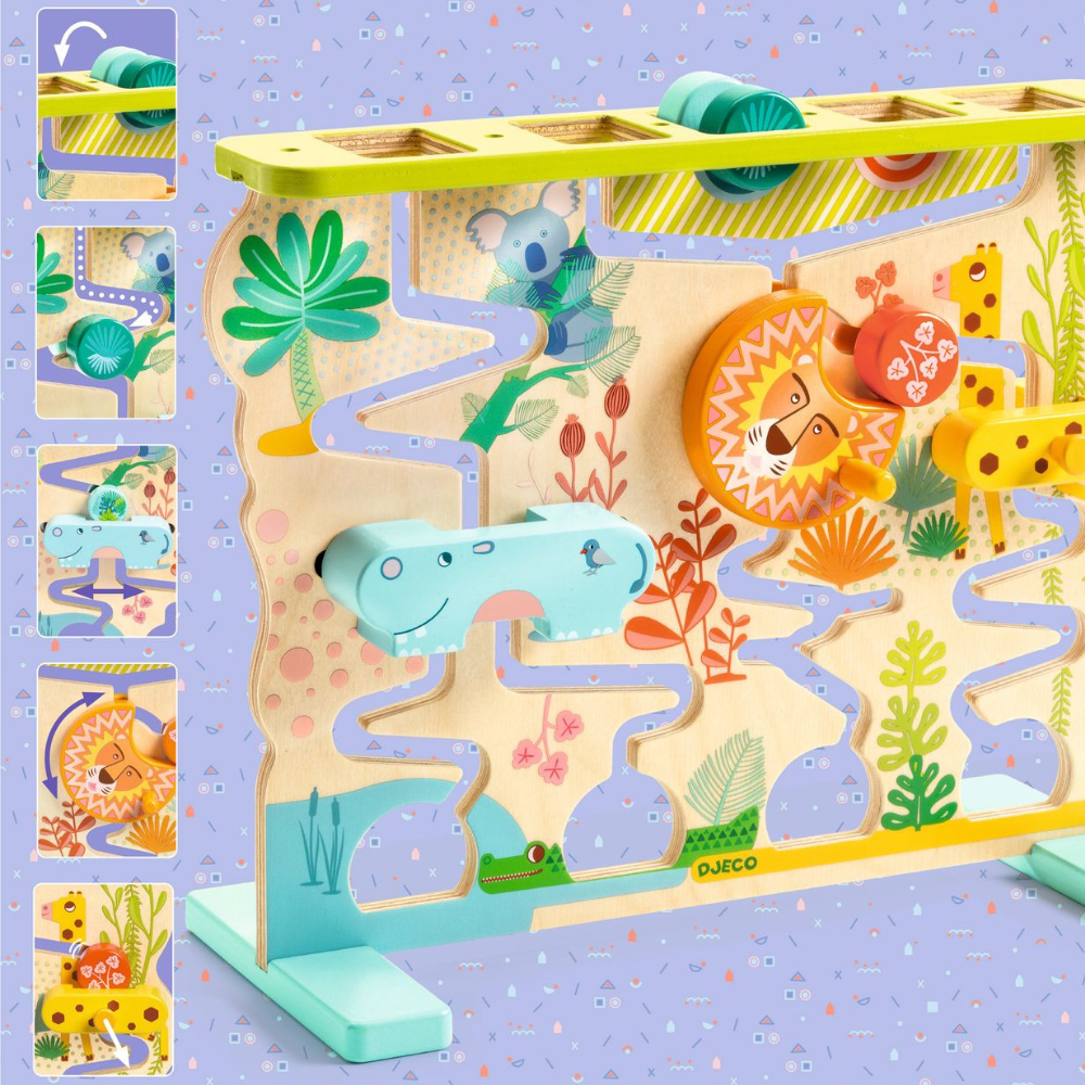 Barnet flyttar träskivorna längst upp och de "glider" långsamt ner till djuren som stoppar dem.