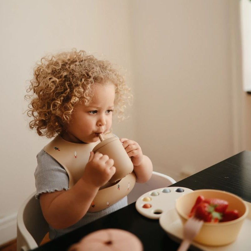 Silikonmugg med sugrör Natural från Mushie är en underbar produkt som underlättar ditt barns övergång från bidon till en vanlig kopp.