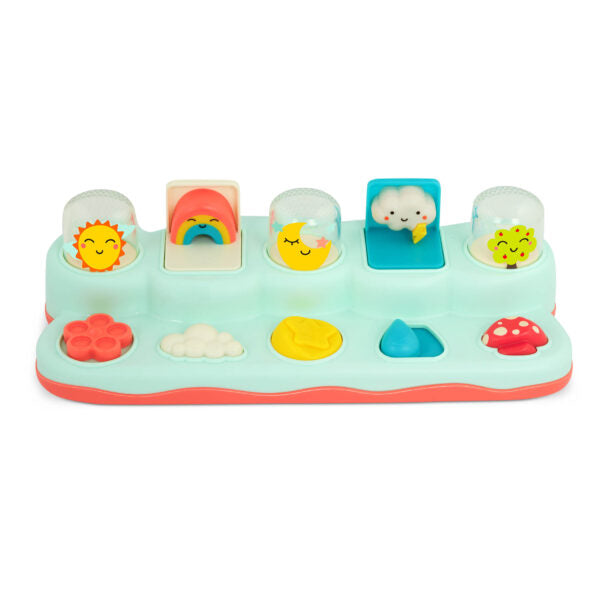 Den interaktiva leksaken från B.Toys har många effekter, t.ex. solen kommer fram när du vrider på en blomma, en regnbåge dyker upp när du trycker på ett moln och månen går upp när du trycker på en stjärna.