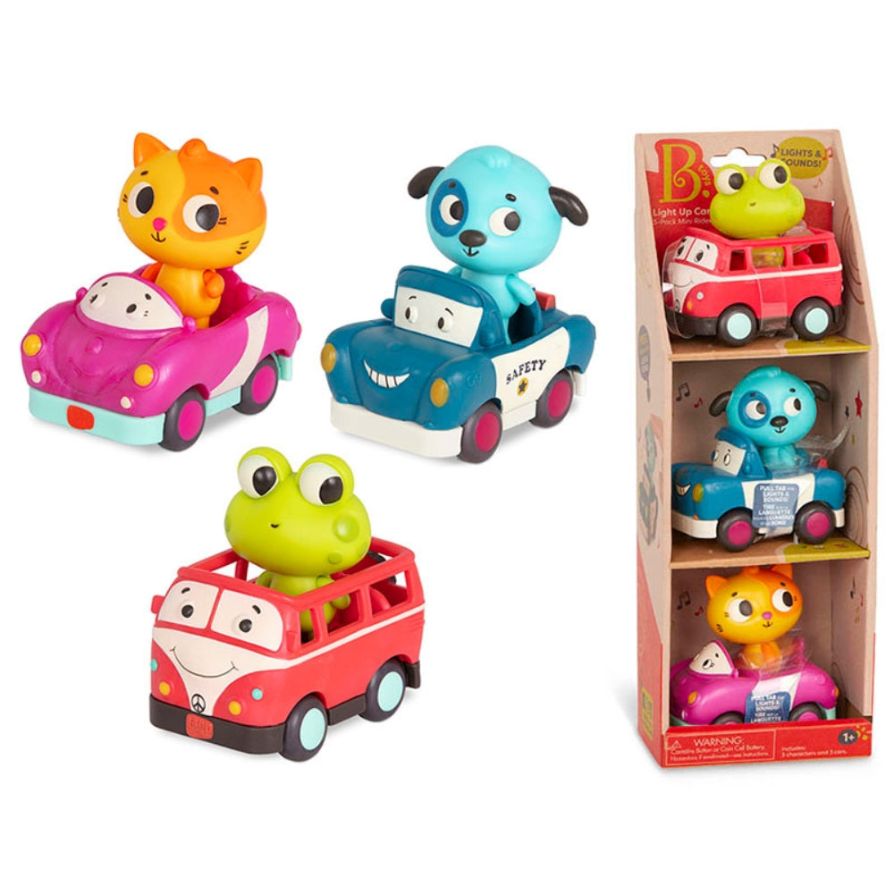 Light Up Cars-setet med 3 mjuka sensoriska bilar från B.Toys är en fantastisk leksak som ger barn möjlighet att leka med motorer utan att behöva batterier.