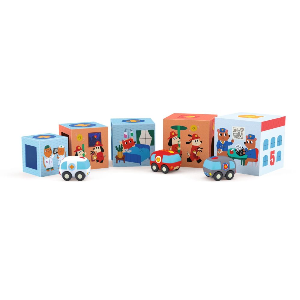 Setet innehåller också 3 bilar som passar perfekt till illustrationerna på kuberna. TopaniCar-klossar för barn från Djeco är ett utmärkt rollspel som utvecklar motorisk koordination, precision, fantasi och uppmärksamhet, lär ut namnen på räddningstjänster och introducerar grunderna i att räkna.