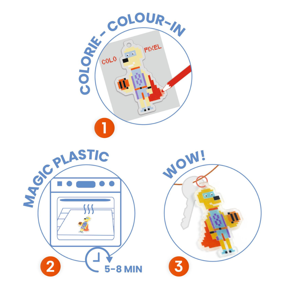 Djeco ist für Kinder, die Handarbeit und den "Wow"-Effekt lieben - mit diesem Kunstset lassen sich bis zu fünf Schlüsselanhänger aus magischem Kunststoff mit verpixelten Superhelden gestalten.
