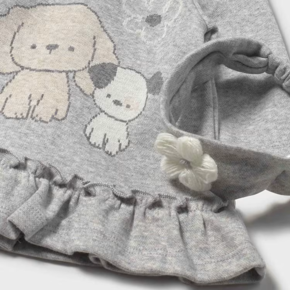 Setet levereras med ett matchande hårband med blommig applikation – en fin detalj som kompletterar stilen på ett harmoniskt sätt.