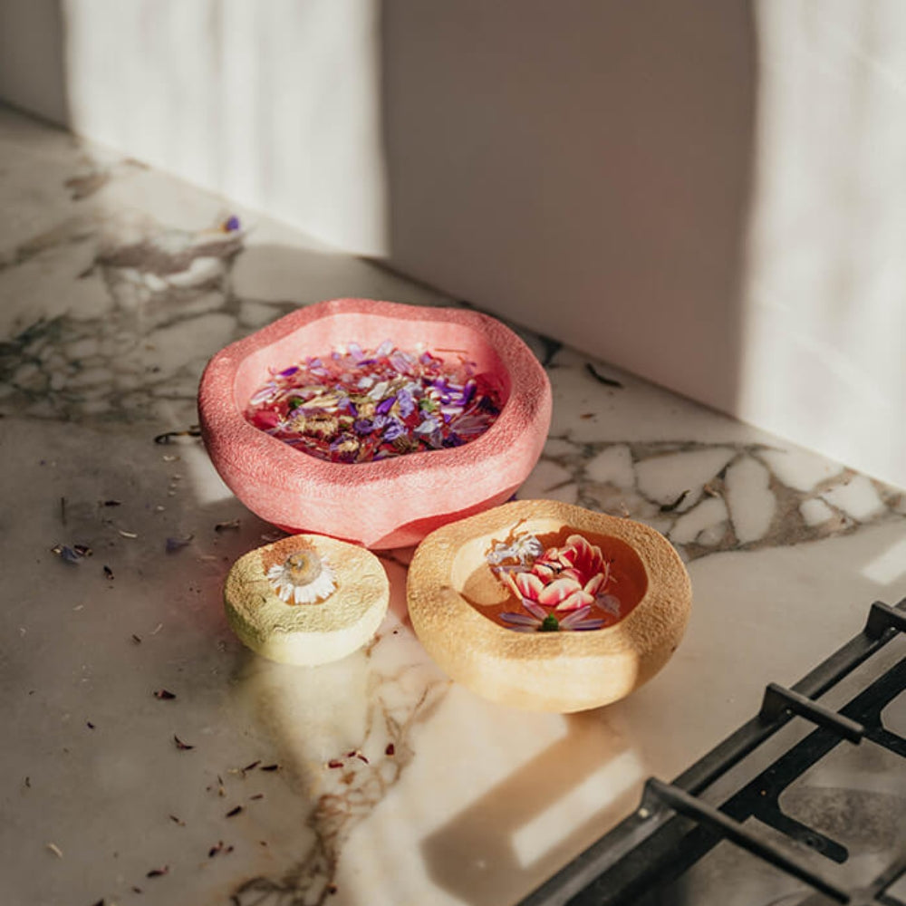 Rörelseleksaken Warm Pastel Set innehåller 3 element i färgerna klarrött, orange och gult.