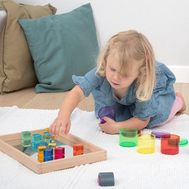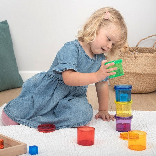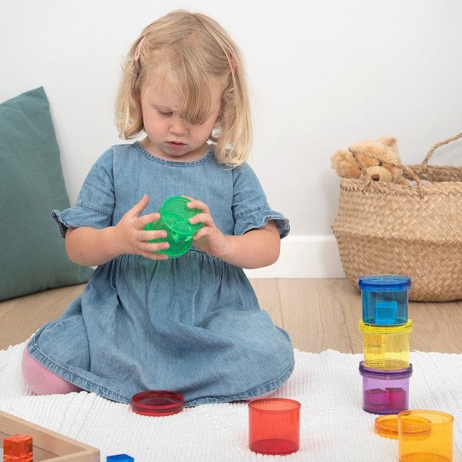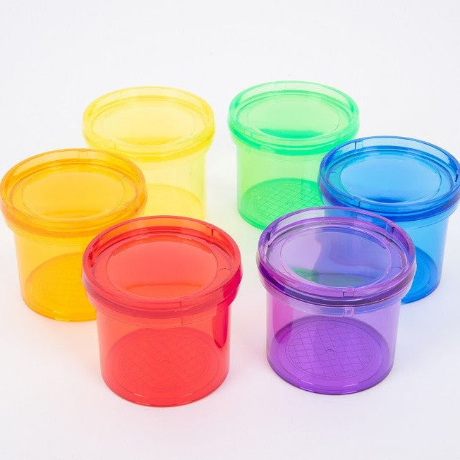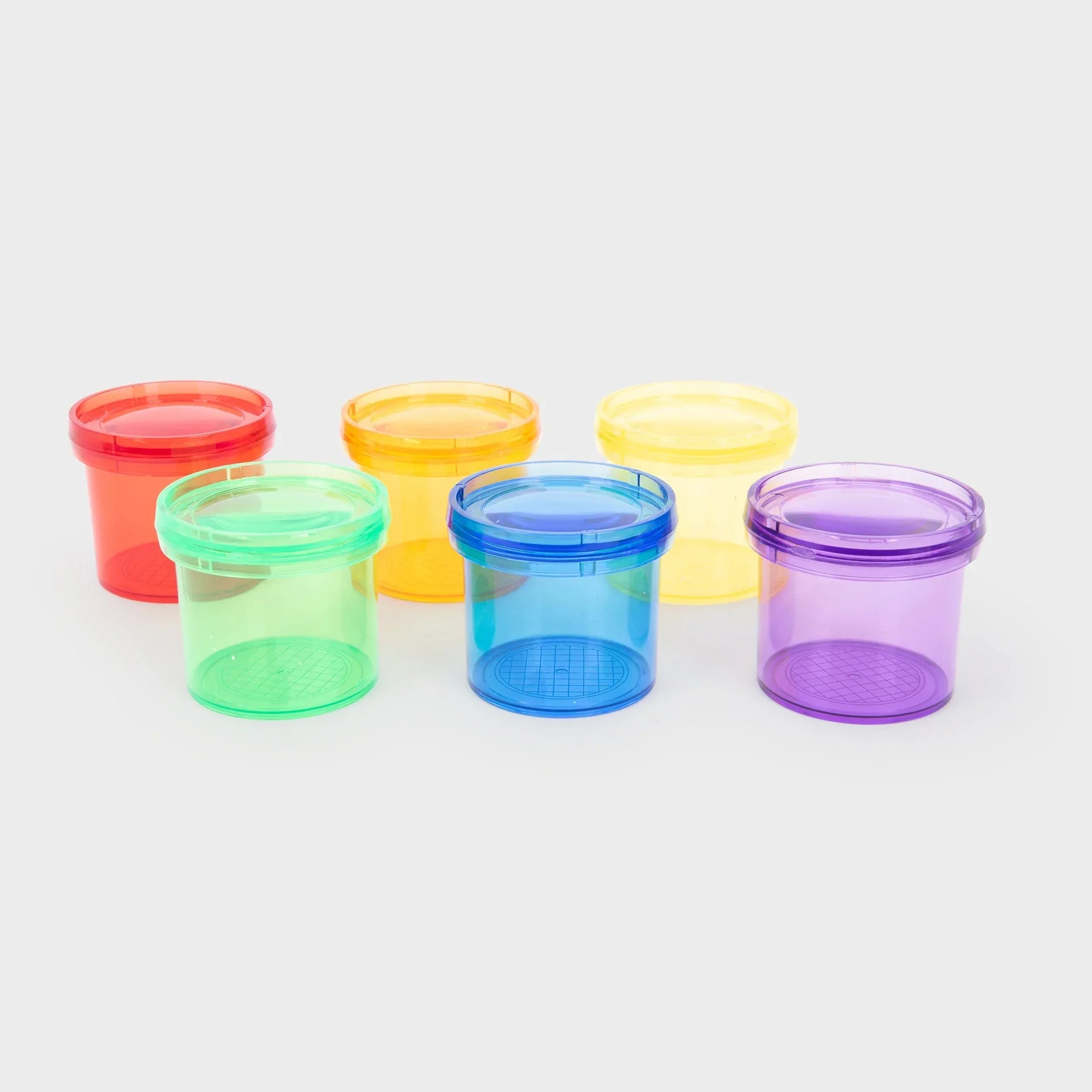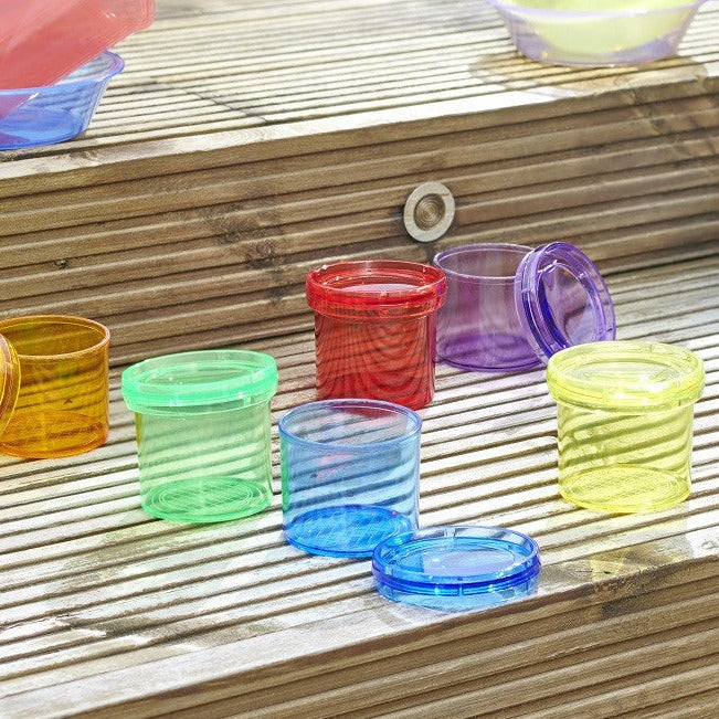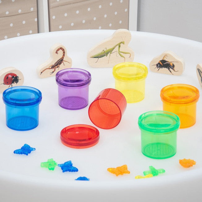Satsen innehåller 6 färgglada, genomskinliga koppar med lock och förstoringsglas.