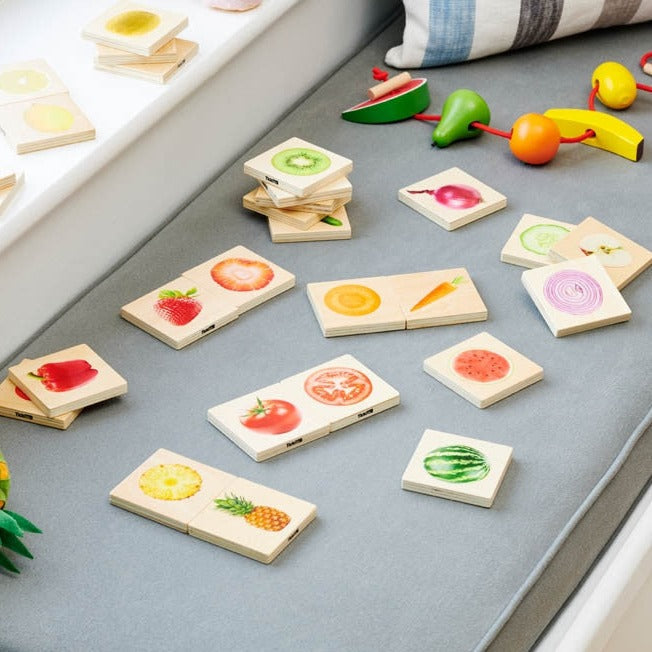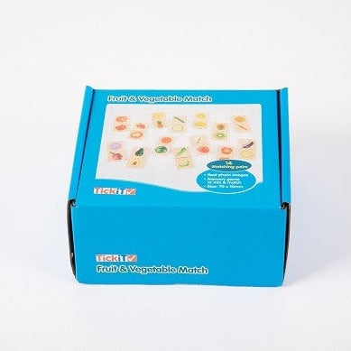 Varje pusselbit har ett färgglatt tryck på ena sidan med en riktig frukt eller grönsak.