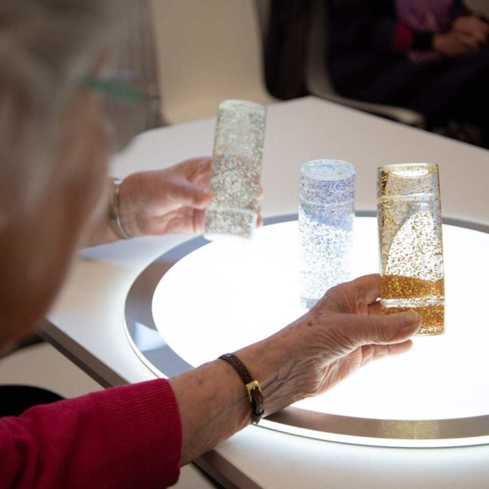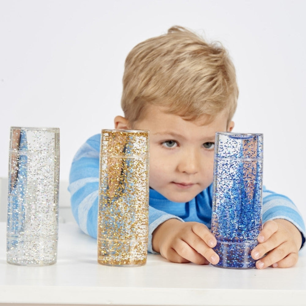 När cylindrarna vänds upp och ner eller skakas bildas en virvlande glitterstorm inuti cylindrarna, som sedan avtar och ger en fängslande och fascinerande källa till lugn koncentration.