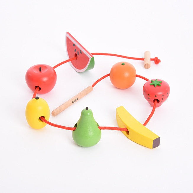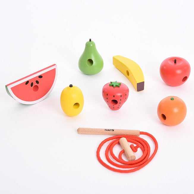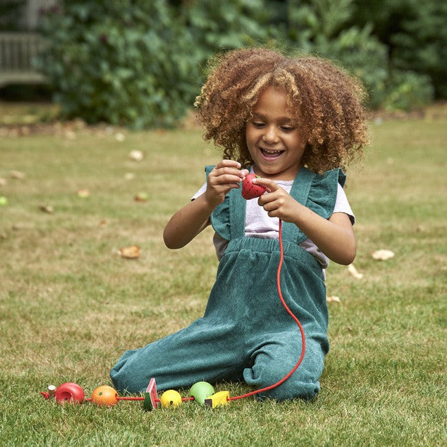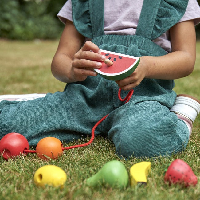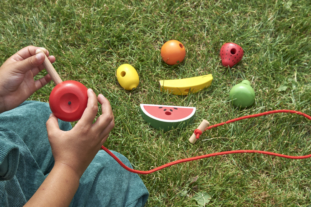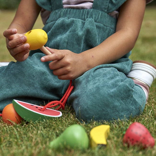 Varje frukt har hål att trä igenom och två snören med trådare och stopp i trä så att ditt barn kan skapa unika hängande dekorationer.