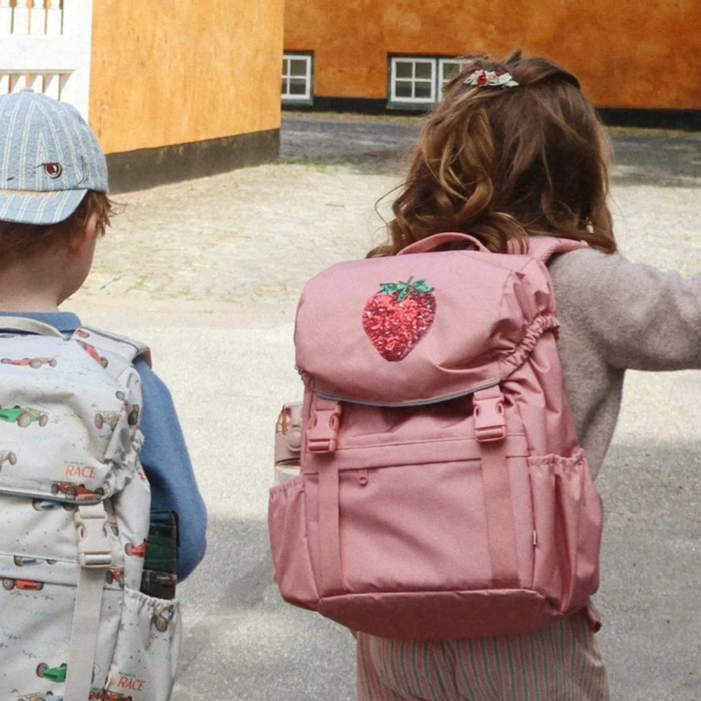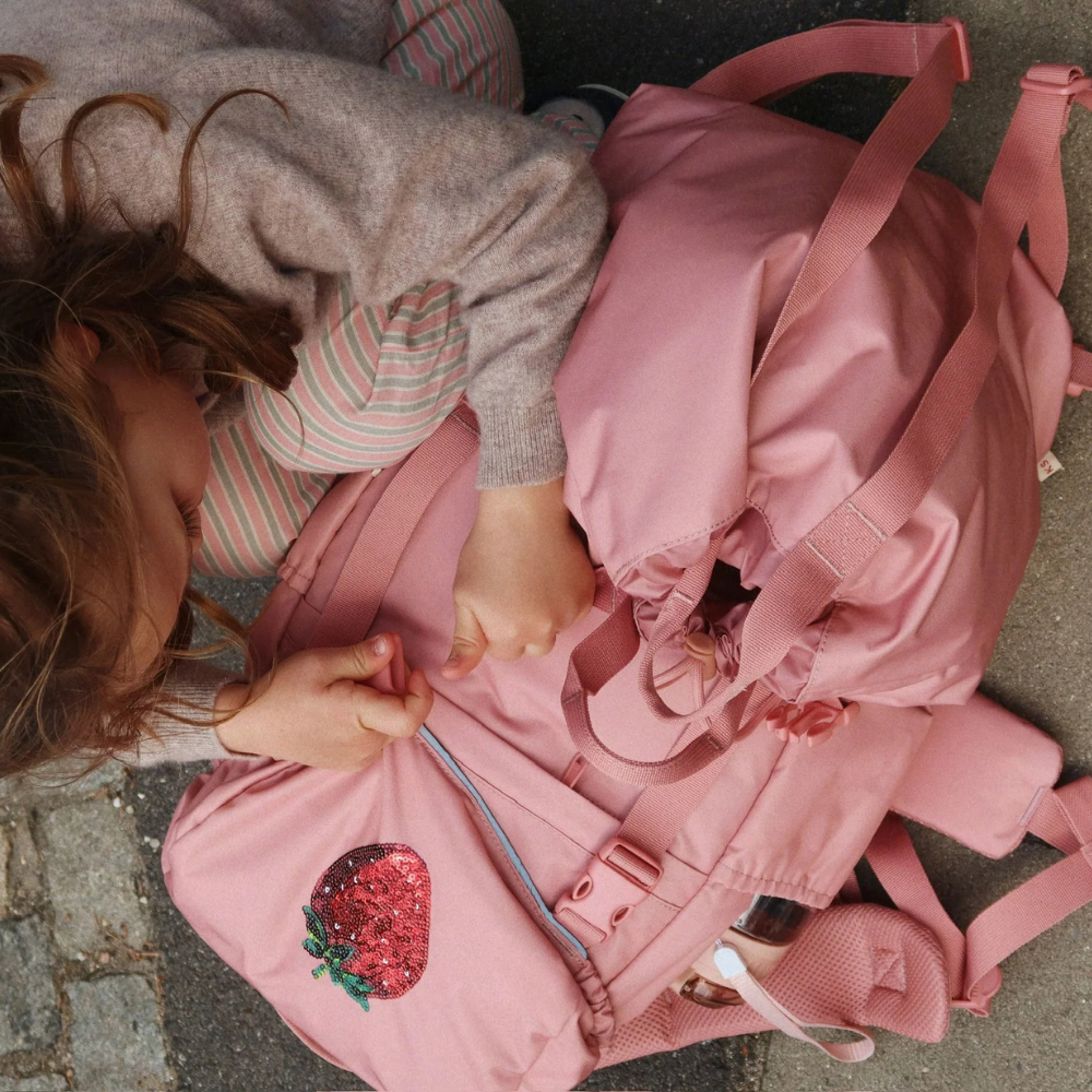 Hela ryggsäcken kan stängas med ett praktiskt spänne och dragsko, som är lätta att använda även för små händer.