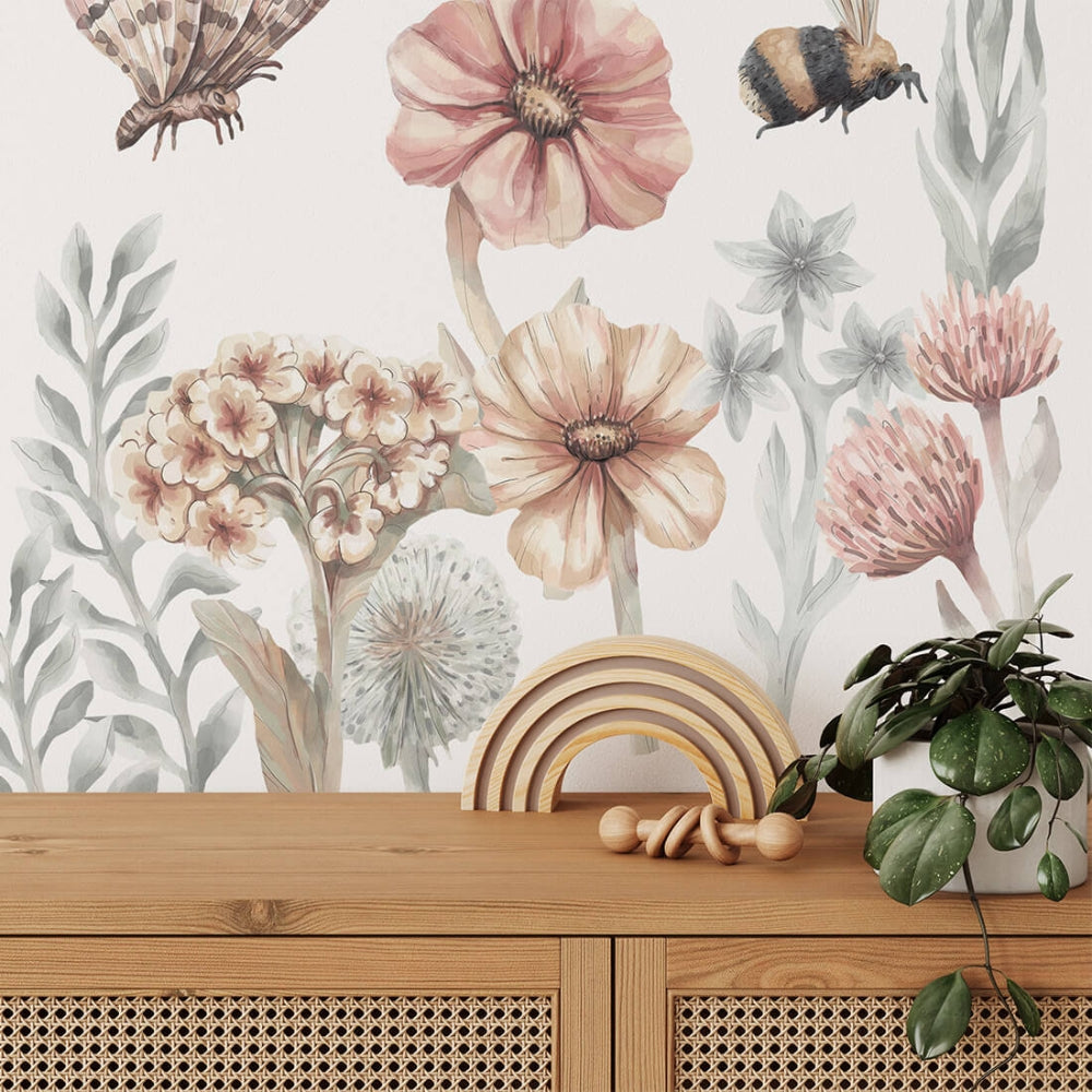 Väggdekalerna för barn är ett charmigt set med akvarellblommor tillsammans med fjärilar och bin, perfekta för att dekorera ett barnrum.