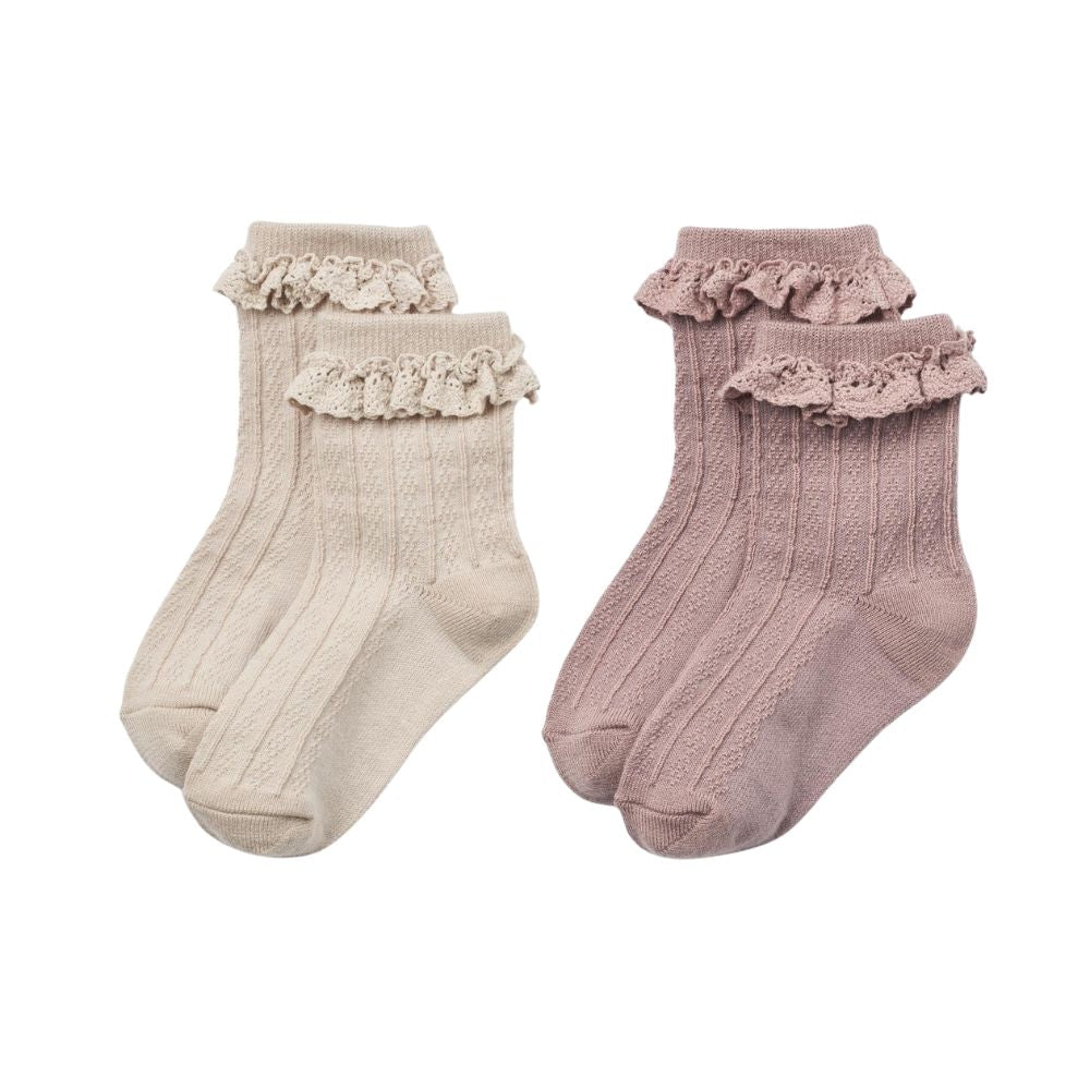 Varje 2-pack innehåller barnstrumpor i dämpade, tidlösa färger som passar både vardags- och mer eleganta kläder.