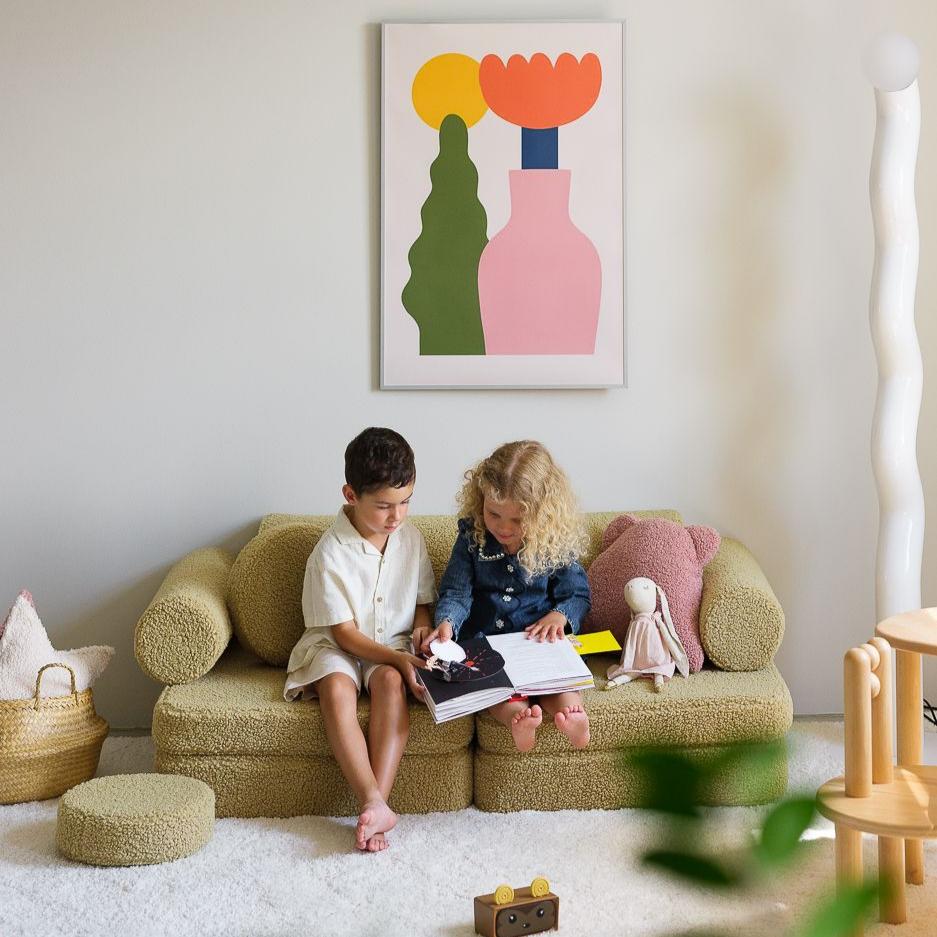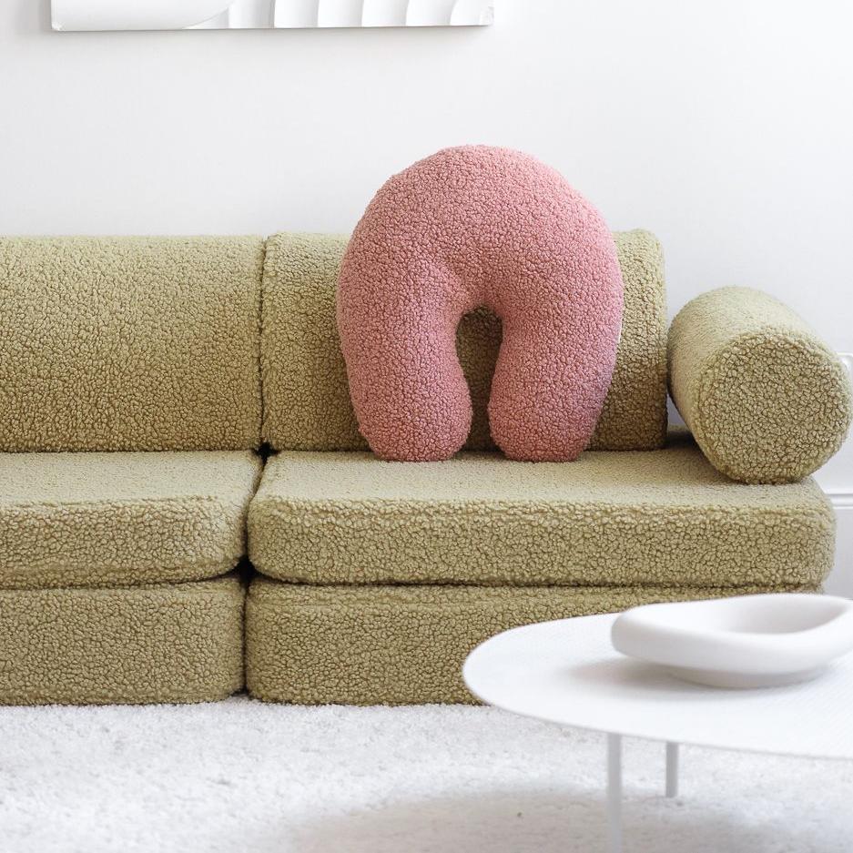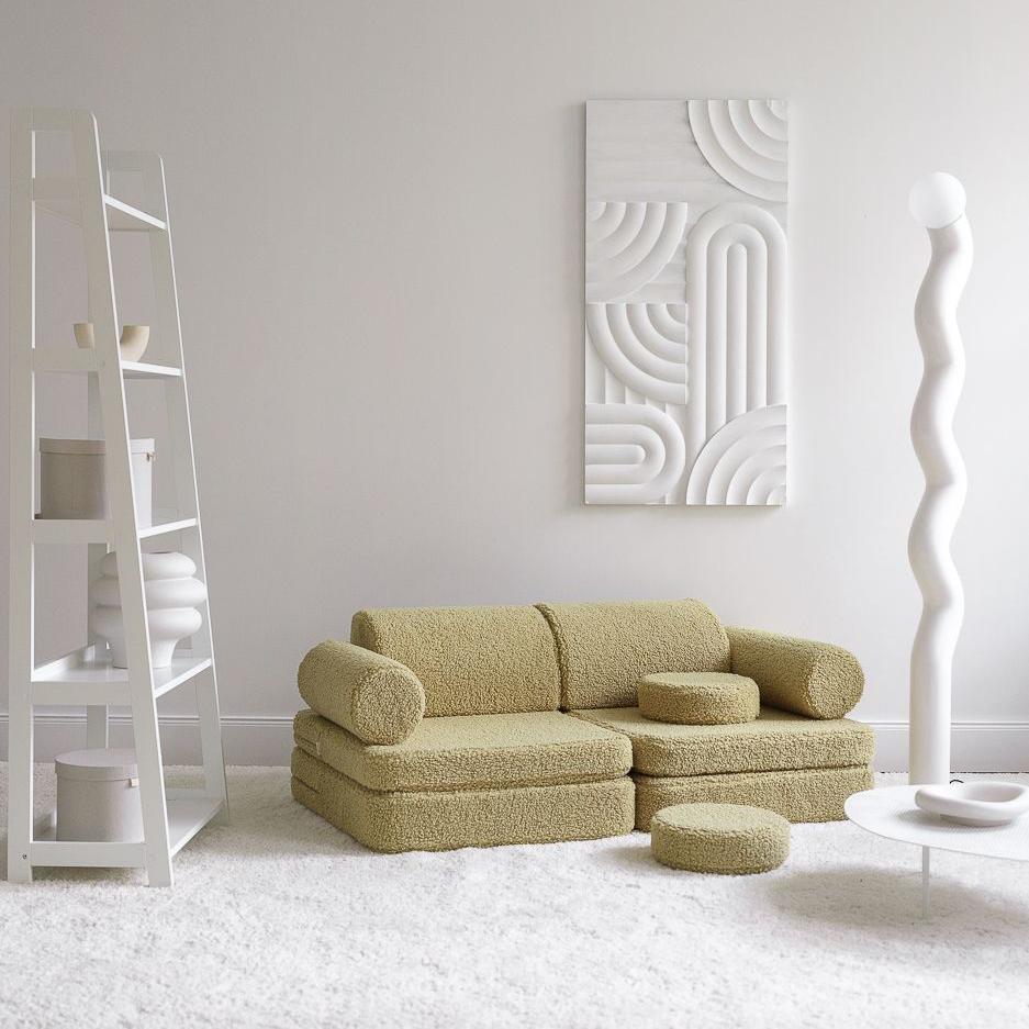 Soffan består av 9 delar – två sittdynor, en stor sittdyna, två triangulära dynor som ryggstöd, två cylinderformade dynor som armstöd och två runda dynor – vilket ger den perfekta kombinationen med obegränsade möjligheter för fantasifull lek och avkoppling.