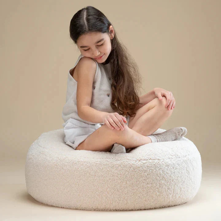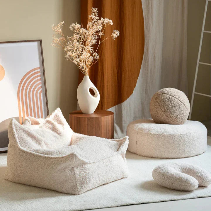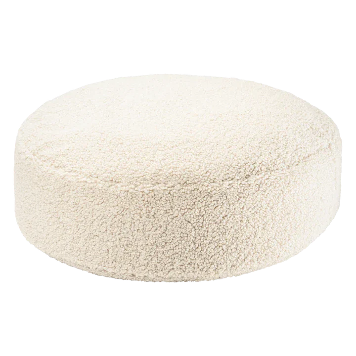 Den mjuka babypuffen i krämvit från Wigiwama är inte bara en stilren inredningsdetalj, utan också en funktionell möbel som passar perfekt som fotpall eller extra sittplats.
