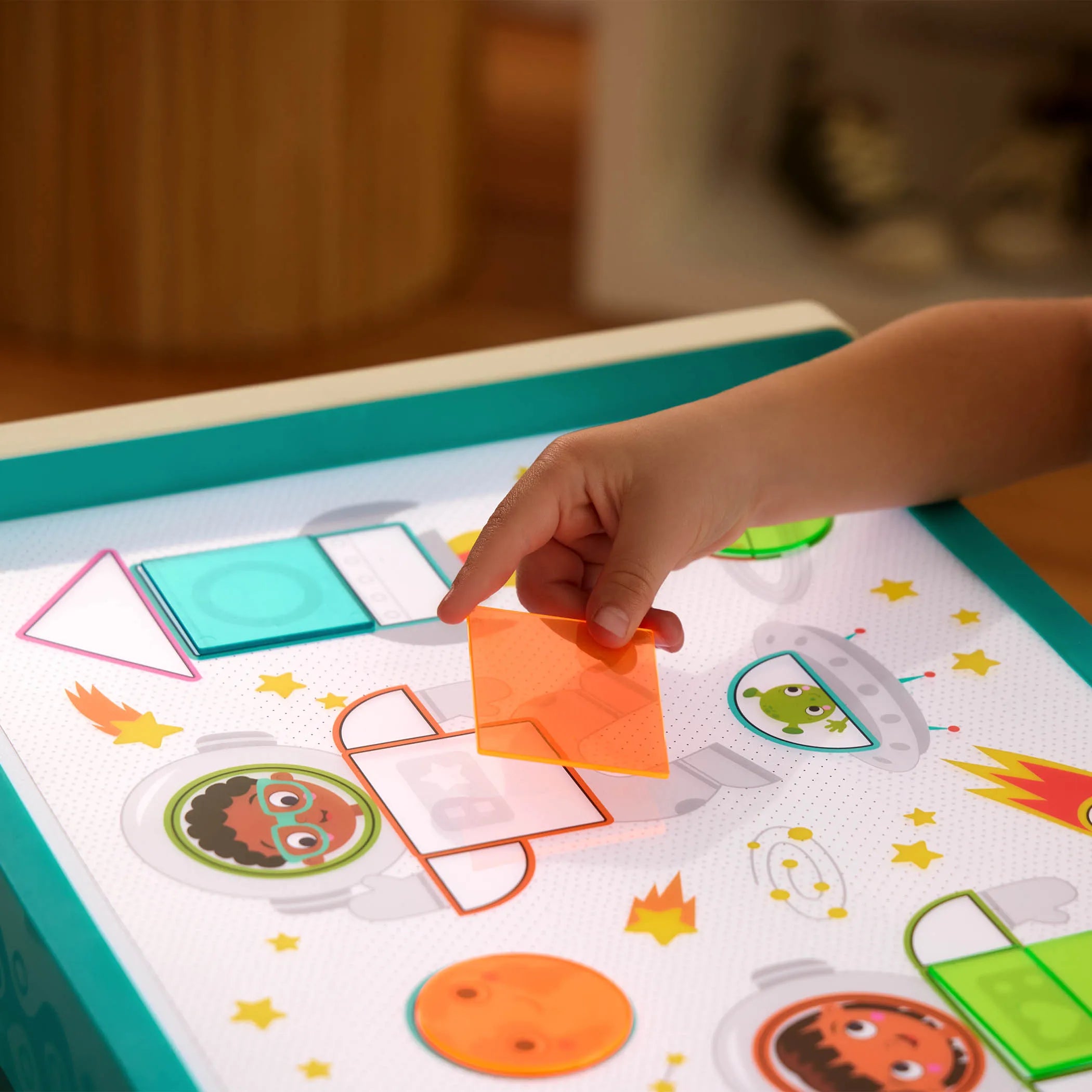 Med fem bakgrundsbelysningsfärger och två ljusstyrkenivåer kommer varje teckning till liv, medan 50 transparenta former, 10 3D-siffror och mallar låter dig experimentera med färglagring, komposition och första räkning.