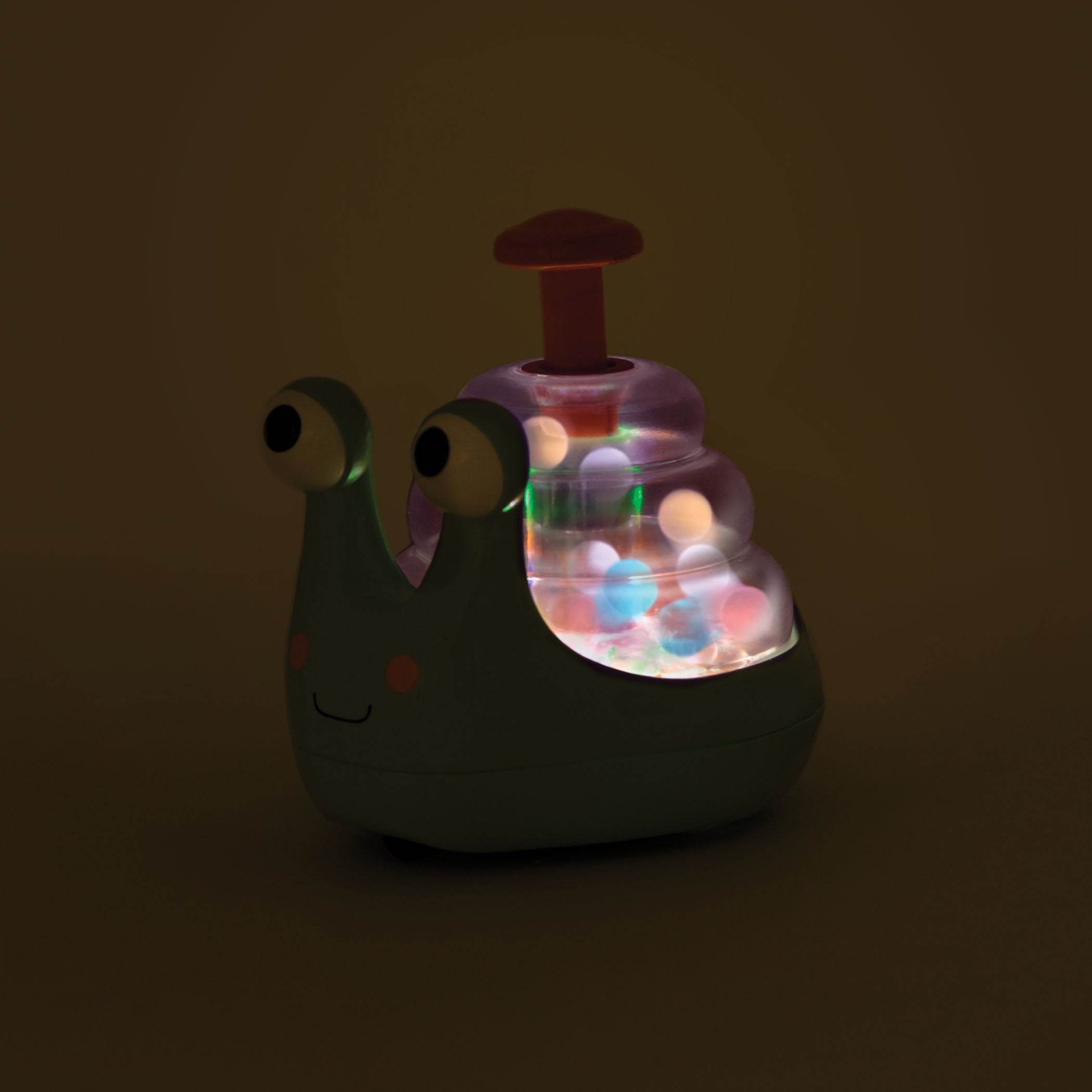 När ett barn trycker på snigeln börjar bollarna inuti skalet röra sig vilt, vilket kommer att locka och hålla barnets uppmärksamhet under en lång stund.