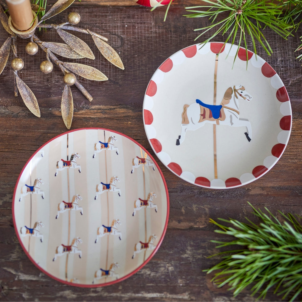 Varje babytallrik är dekorerad med ett handmålat karusellmotiv, vilket ger dem en unik karaktär och nostalgisk charm.