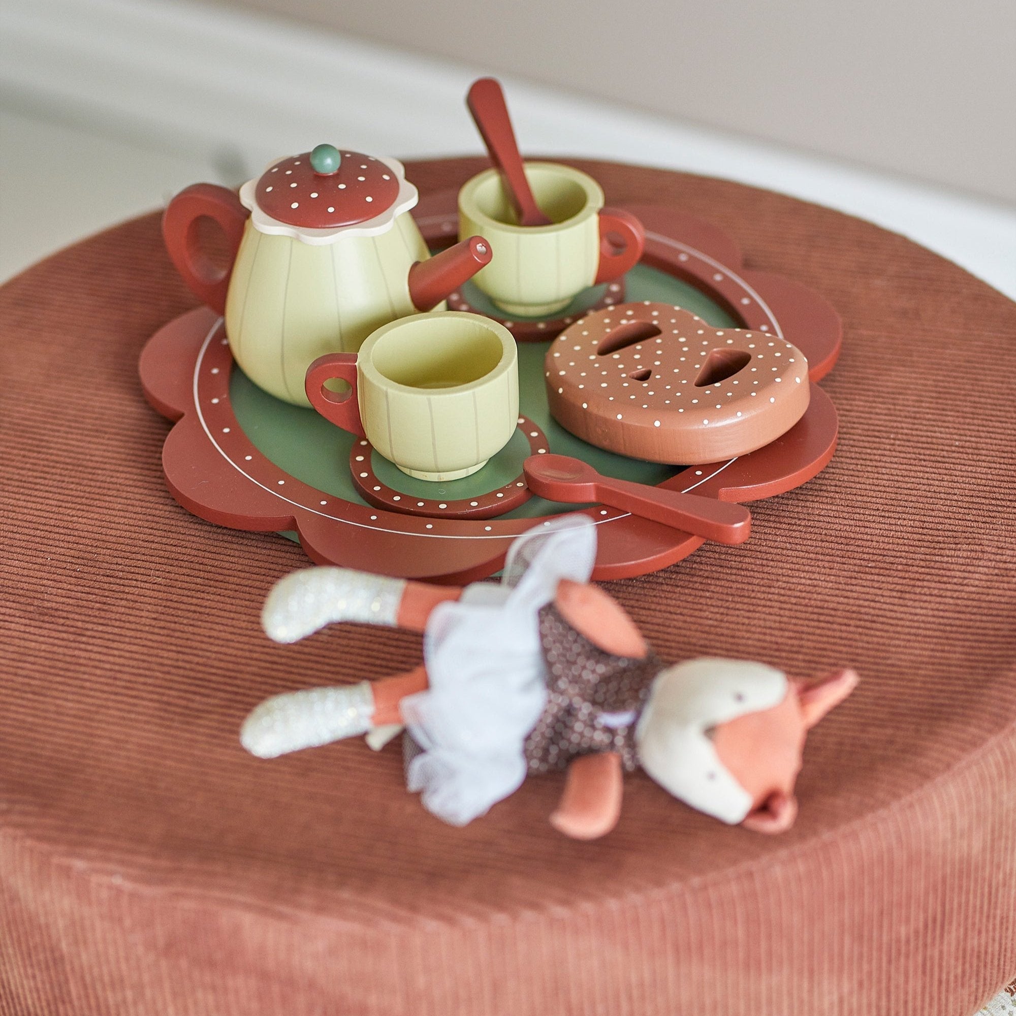 Det innehåller en bricka, tekanna, koppar, fat, skedar och en kringla, alla i dämpade, mjuka färger som passar perfekt i alla inredningar.
