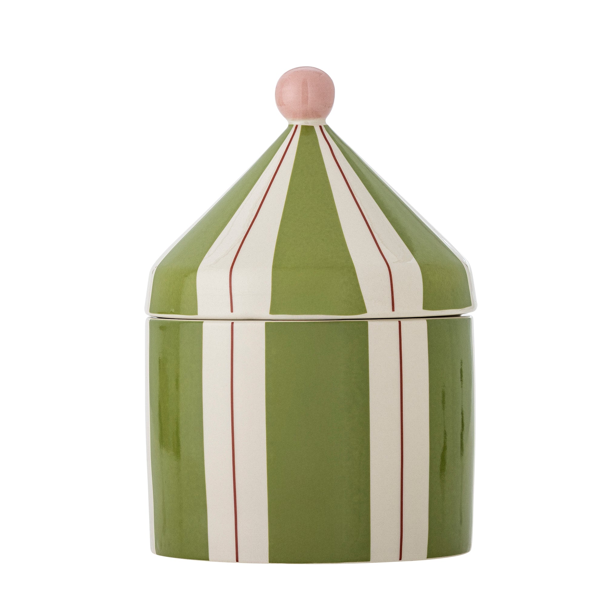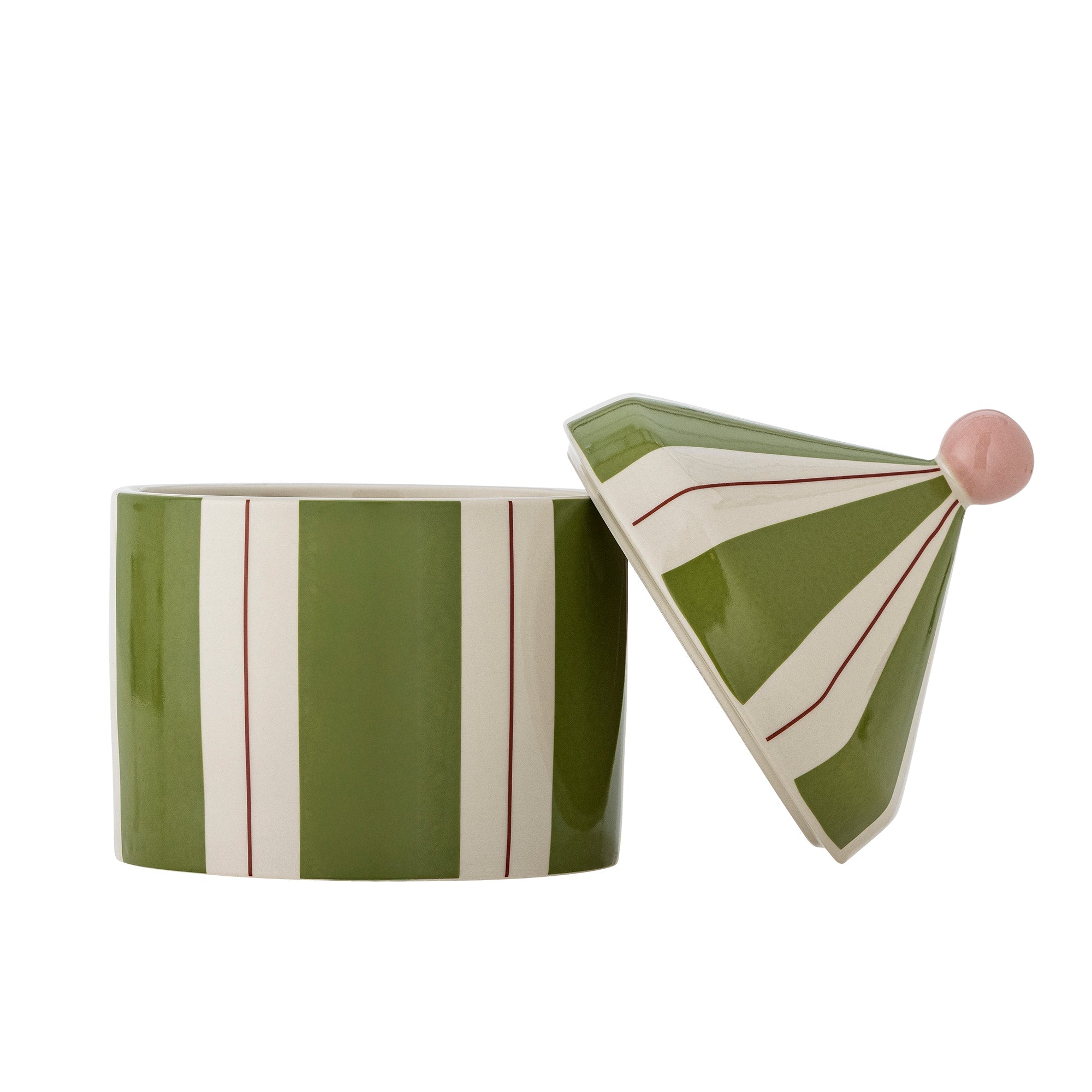 Förvaringsbehållaren har den söta formen av ett cirkustält och är tillverkad av stengods med gröna och vita ränder.