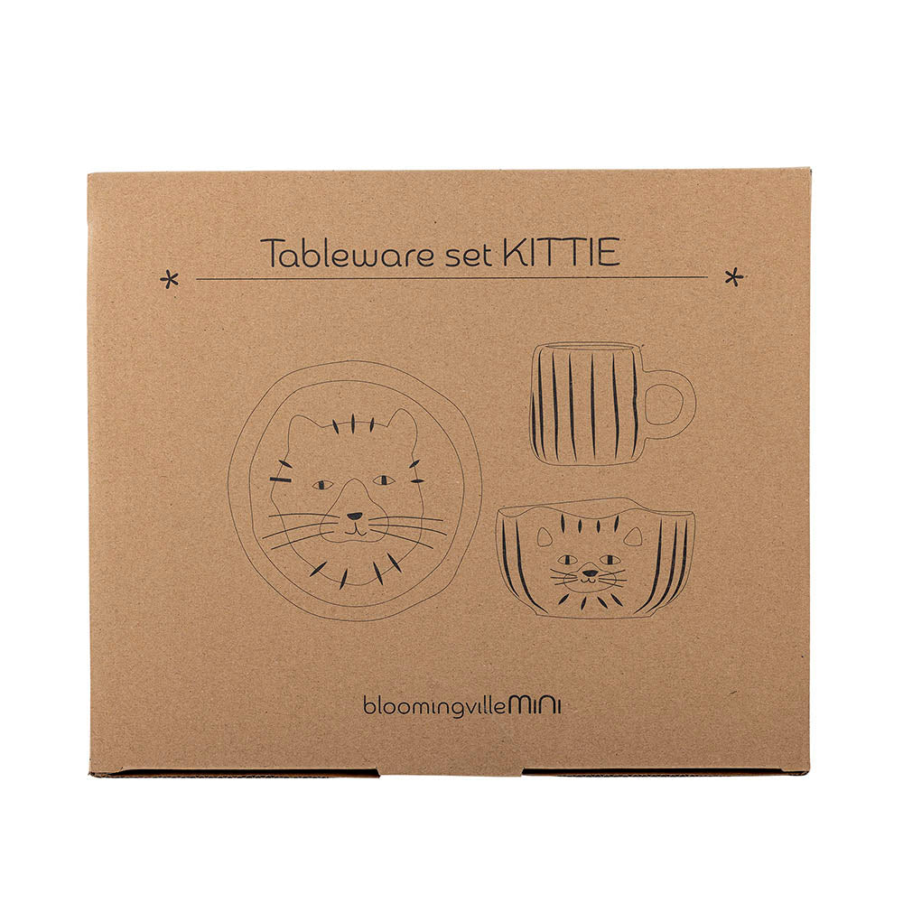 Barnservisen Kattie från Bloomingville Mini innehåller en tallrik, en skål och en mugg, alla designade med barnets behov i åtanke.