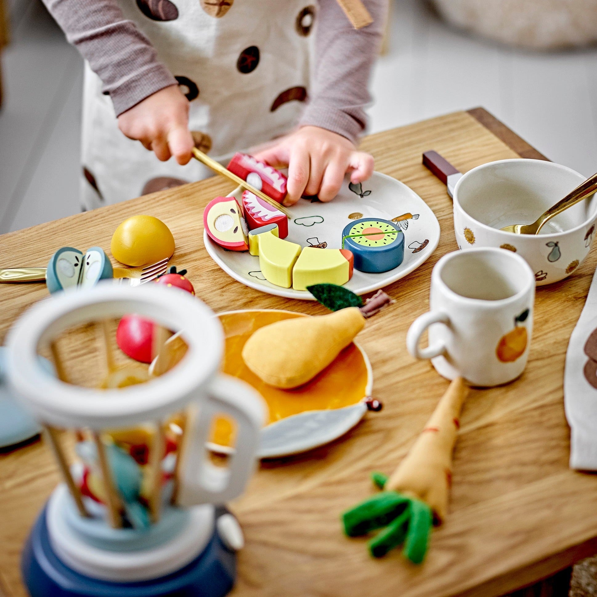 Träblandare Lene med frukt, liten kopp och kniv från Bloomingville.