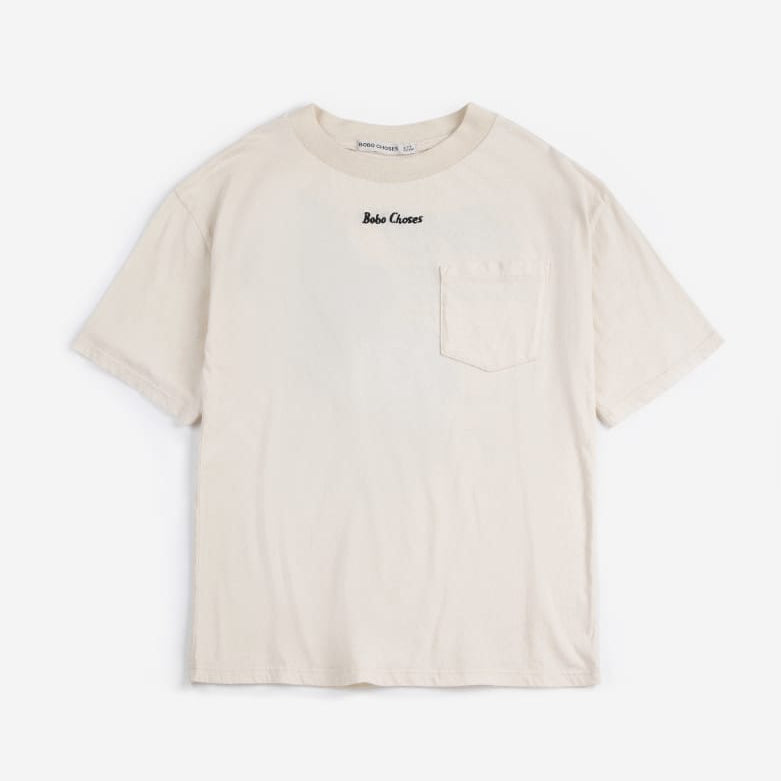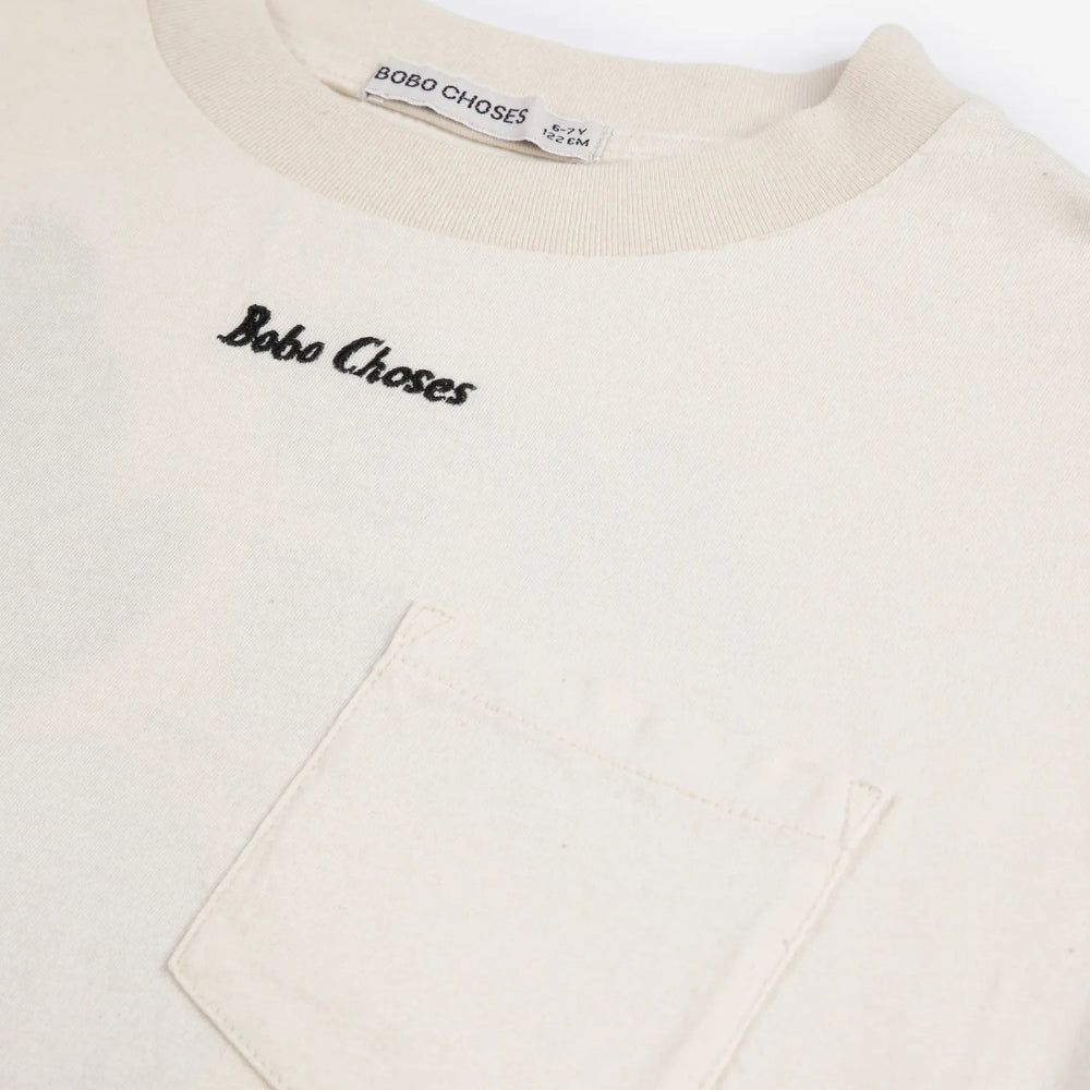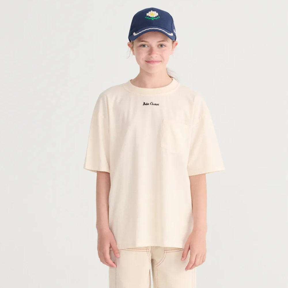 Bobo Choses barn-T-shirt i mjuka färger är ett bekvämt vardagsalternativ, designat för rörelsefrihet och barnslig glädje.