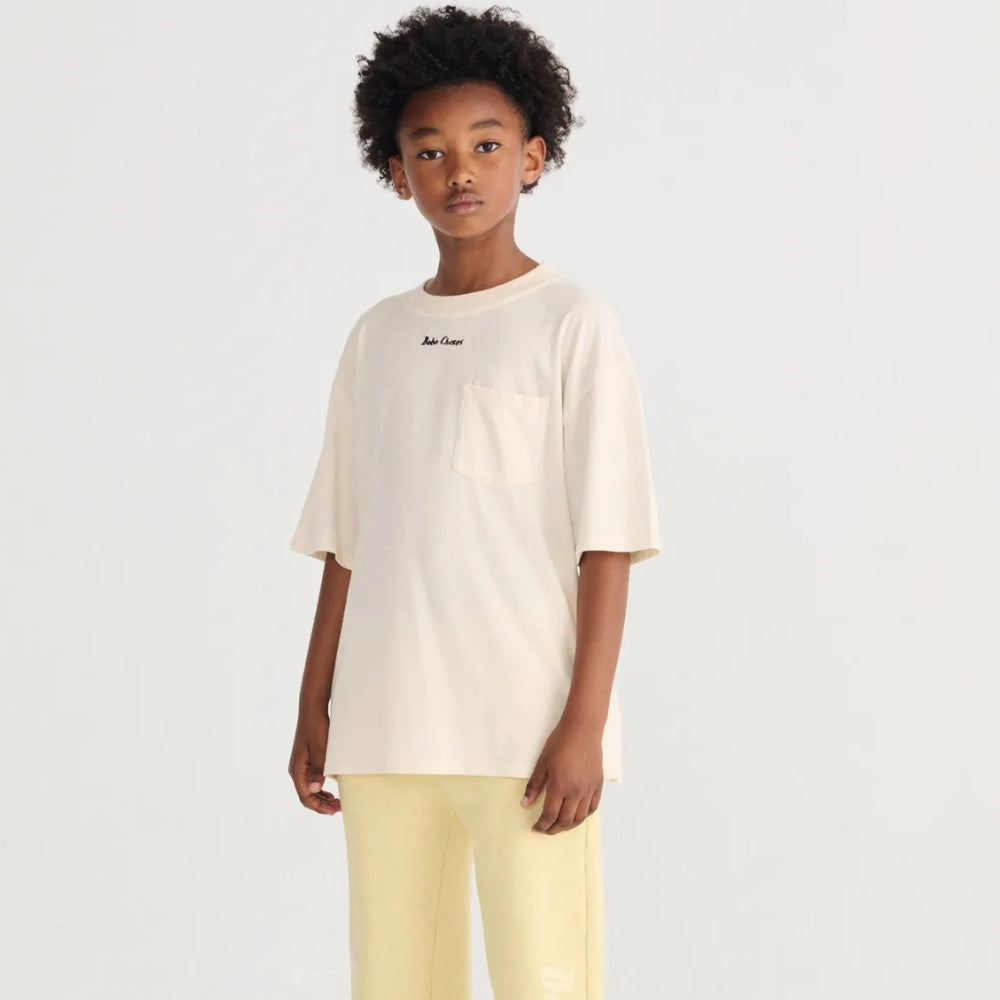 Den vida oversized-skärningen gör barn-T-shirten perfekt för lek, promenader eller familjeutflykter, medan det vänliga trycket ger den en lätt och glad känsla.