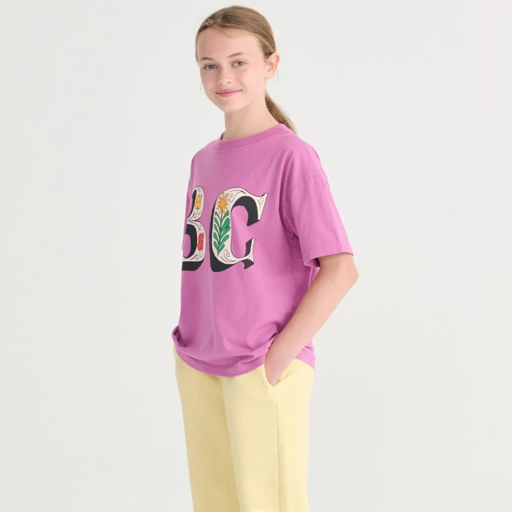 Bobo Choses barn-T-shirt i mjukt rosa är ett bekvämt vardagsalternativ, designat för rörelsefrihet och barnslig glädje.