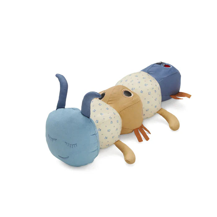Det sensoriska leksaken i form av en larv har olika texturer som prasslar, speglar, band, en skallra och en liten klocka.