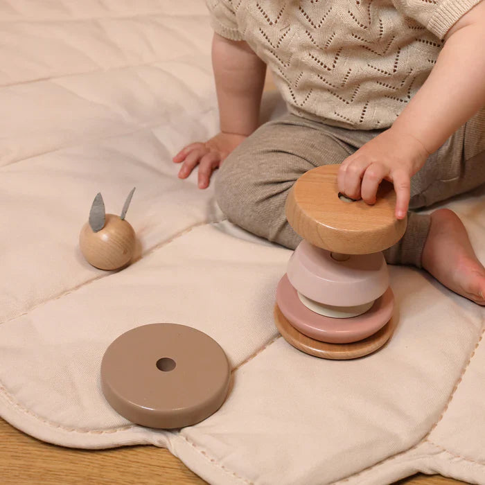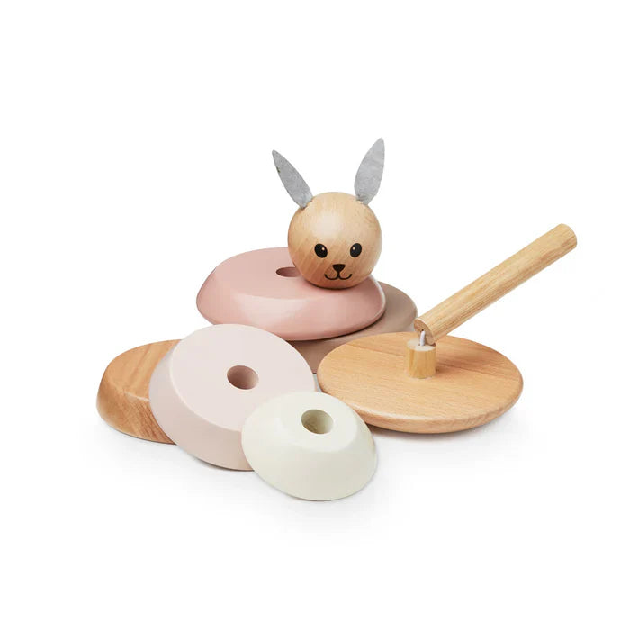 Bunny, en stapelbar pyramid i trä för barn med ett gulligt kaninansikte och långa öron i filt från Cam Cam, som ytterligare stimulerar känseln.
