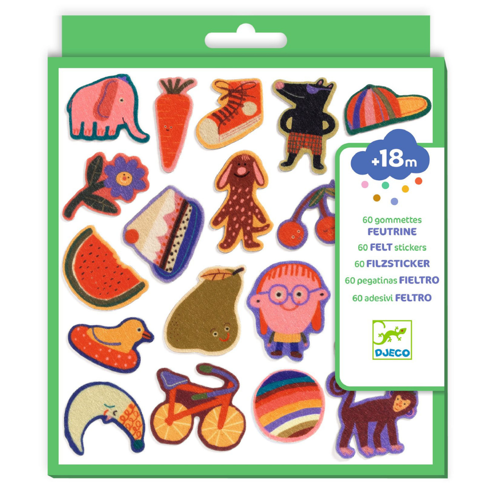 Nicht weniger als 60 Elemente warten im Inneren, und die Filzsticker sind angenehm weich, leicht zu greifen und haben lustige Formen von Figuren und Gegenständen, die sofort zum Handeln anregen.