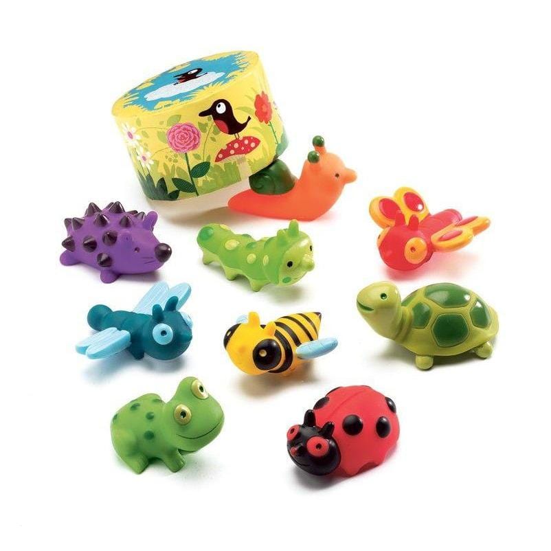 - Satsen innehåller: 9 smådjur (fjäril, nyckelpiga, bi, snigel, igelkott, groda, trollslända, sköldpadda, larv), 1 låda för att gömma djuren, 15 räknekort blommor och blad