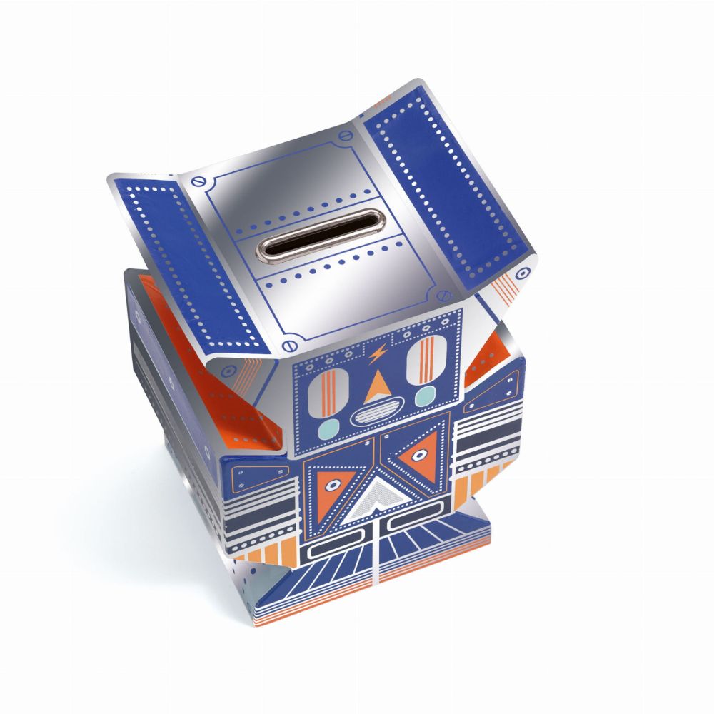 Denna spargris från Djeco i form av en trärobot är dekorerad med metallglans.