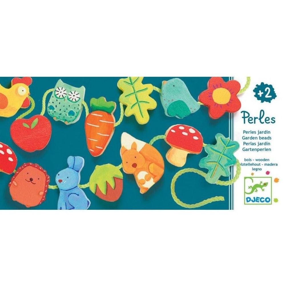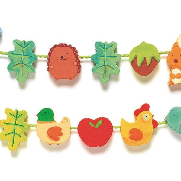 Barnens trådspel har 16 färgglada pärlor, inklusive djur, blommor och grönsaker.