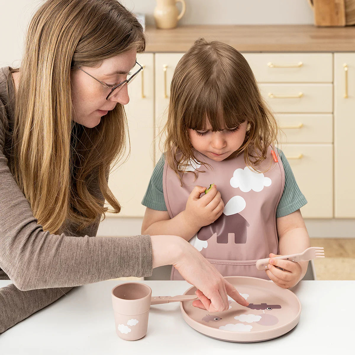Den rosa babytallriken är tryckt med ett bedårande motiv av Done by Deer-vänner i molnen.