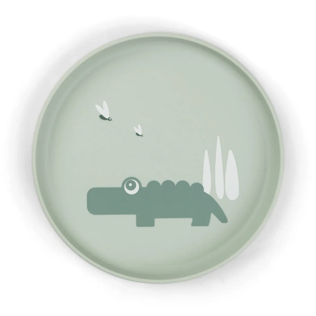 Den gröna barnplattan är tryckt med ett coolt motiv av en hjärtlig Croco-krokodil som stirrar på ett par eldflugor.