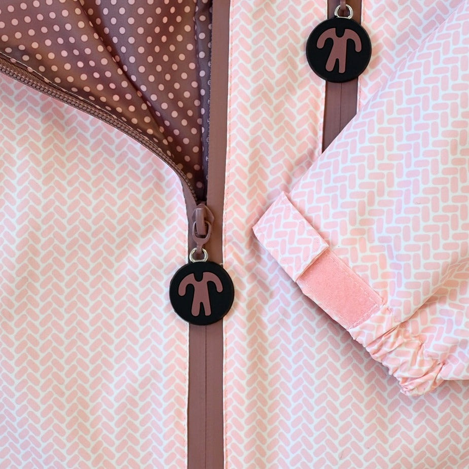 Barnens regndräkt kan vikas in i en liten ficka, som är placerad på insidan av benet.