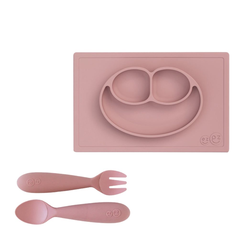 EZPZ 2-i-1 sugkoppstallrik Happy Mat + silikonbestickset pastellrosa