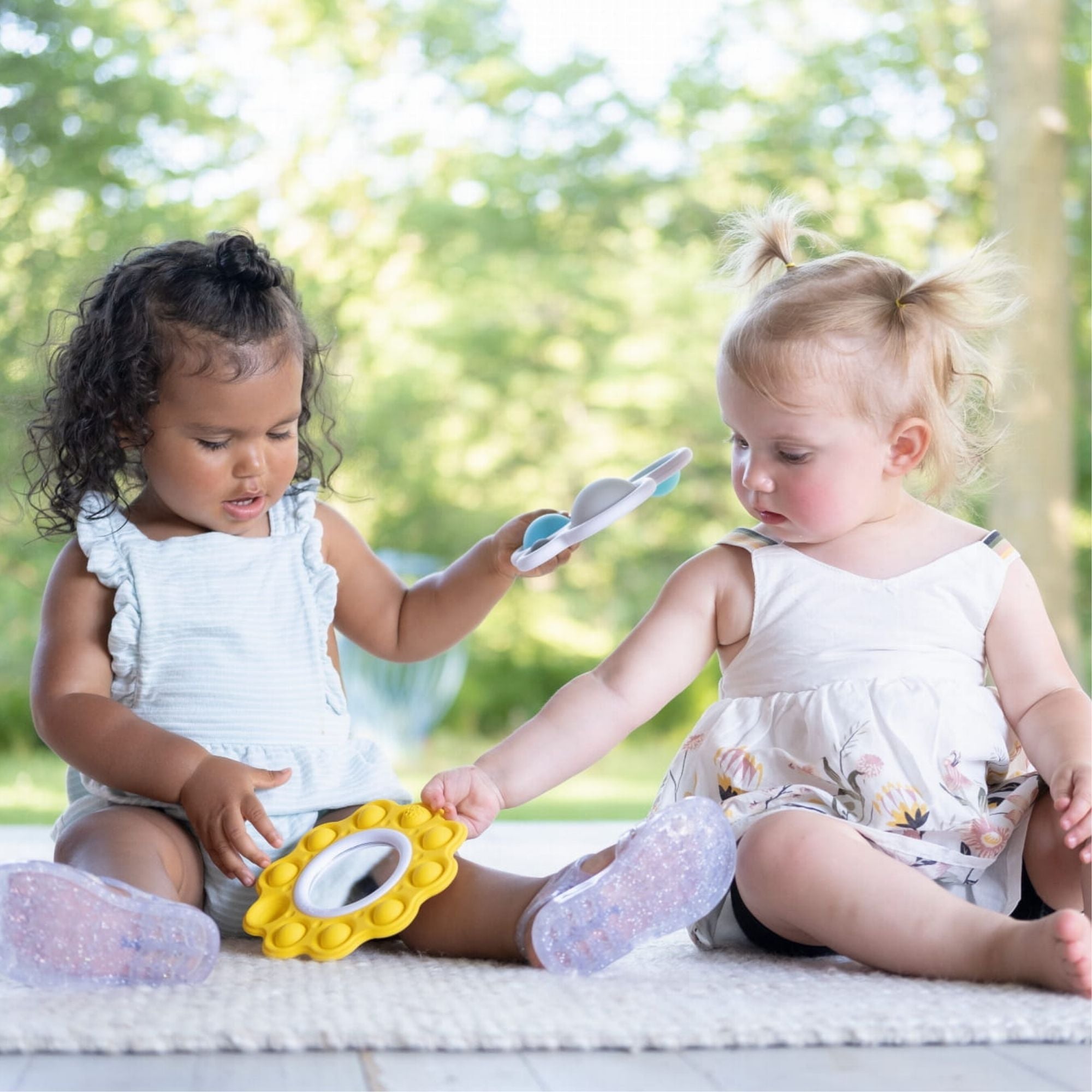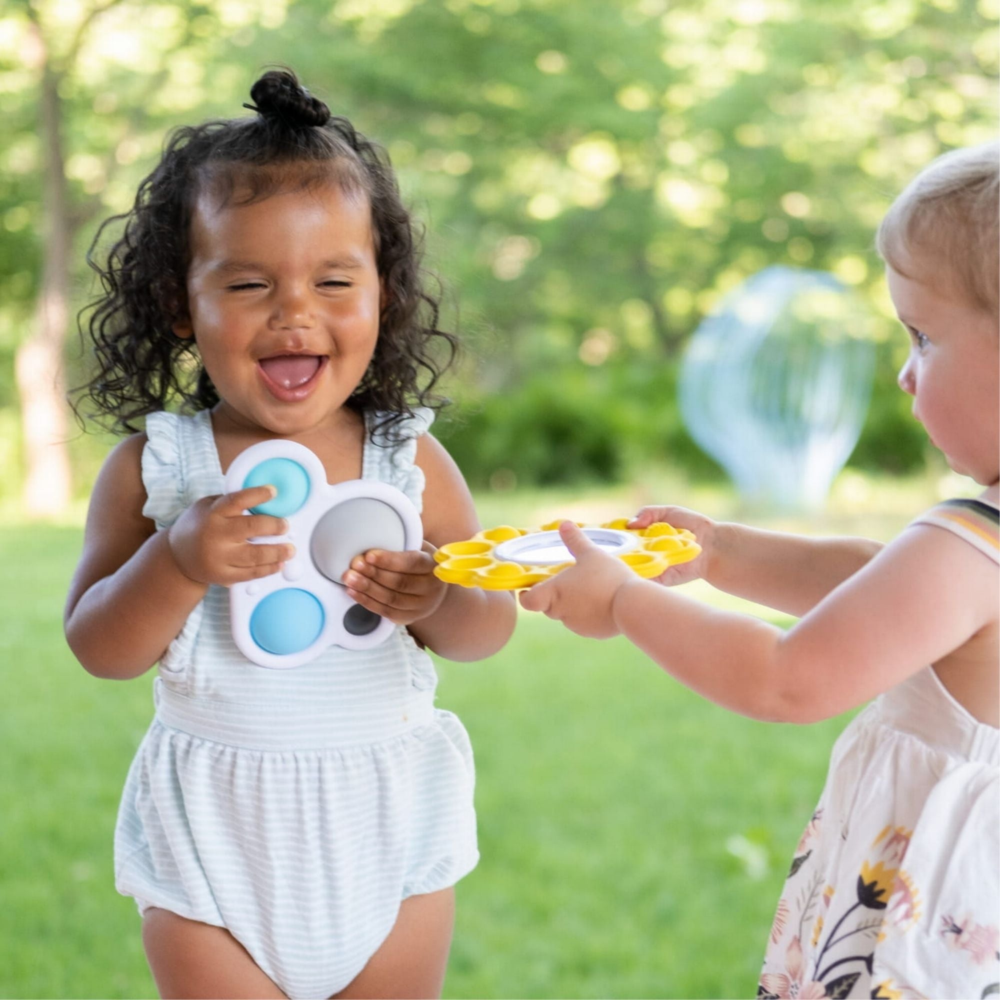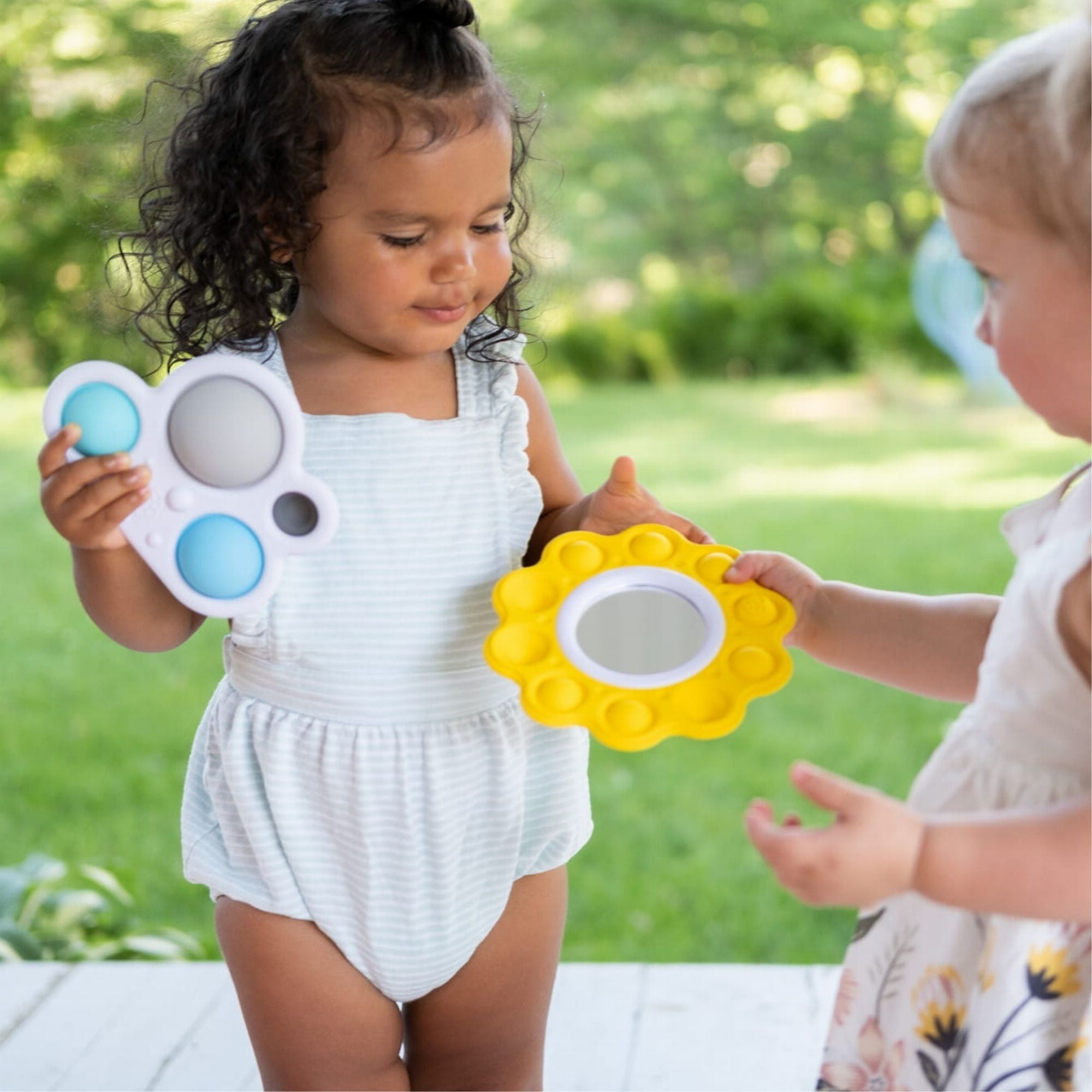 Fat Brain Toys Bubbles Dimpl att klämma på är: Sunshine, som har en dubbelsidig spegel inuti och de gula strålarna runt spegeln är silikonbubblor, och Cloud, som innehåller fyra Dimpl-bubblor i olika storlekar i en plastram i form och färger som ett fluffigt moln.