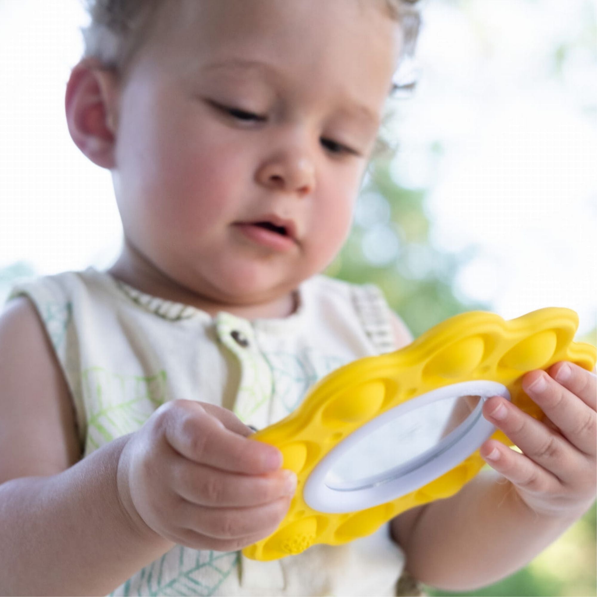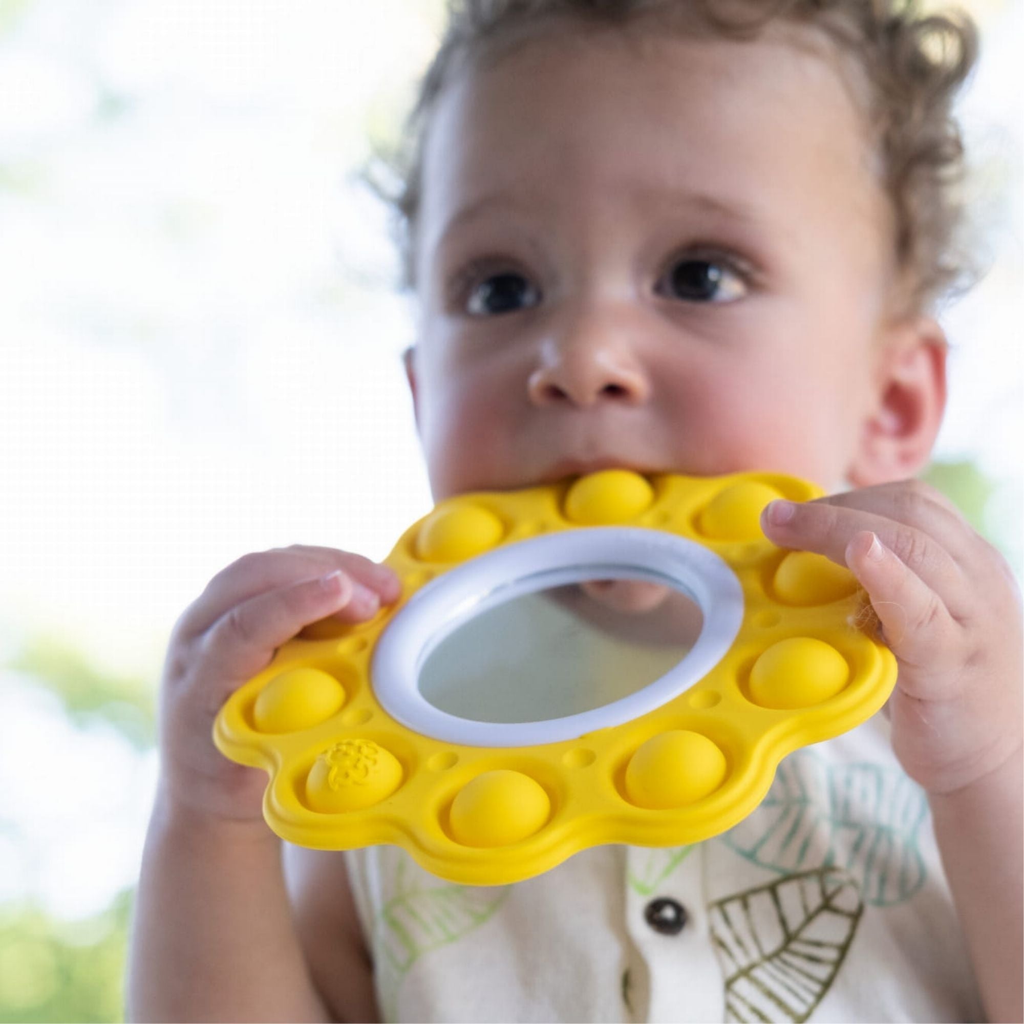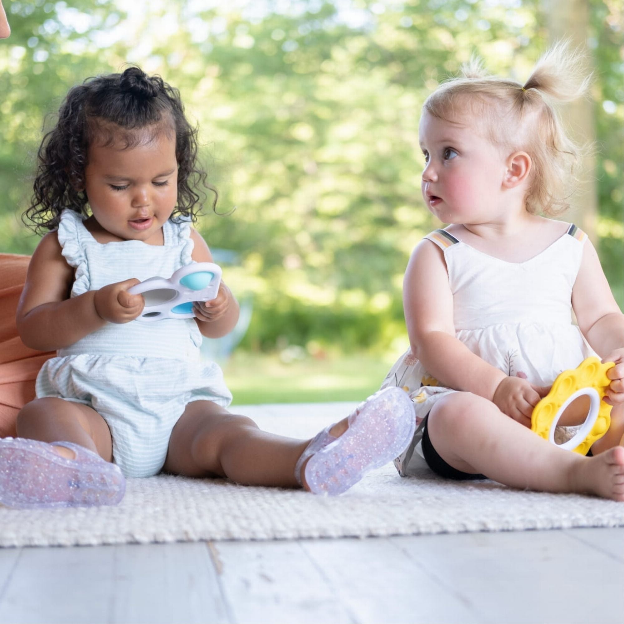 Fat Brain Toys Bubbles Dimpl att klämma på är: Sunshine, som har en dubbelsidig spegel inuti och de gula strålarna runt spegeln är silikonbubblor, och Cloud, som innehåller fyra Dimpl-bubblor i olika storlekar i en plastram i form och färger som ett fluffigt moln.