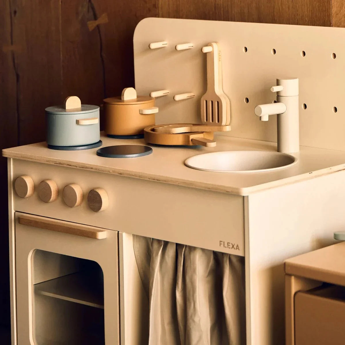 Det träiga barnköket är en fantastisk lekplats där de små kan leka vardagliga situationer – laga middag, baka söta desserter eller diska för sina nära och kära.