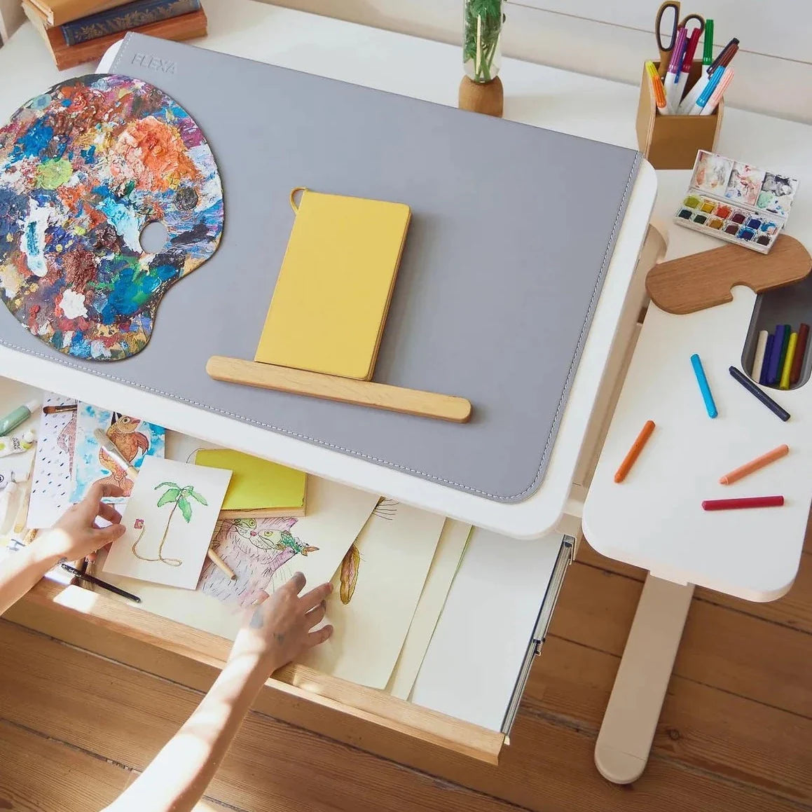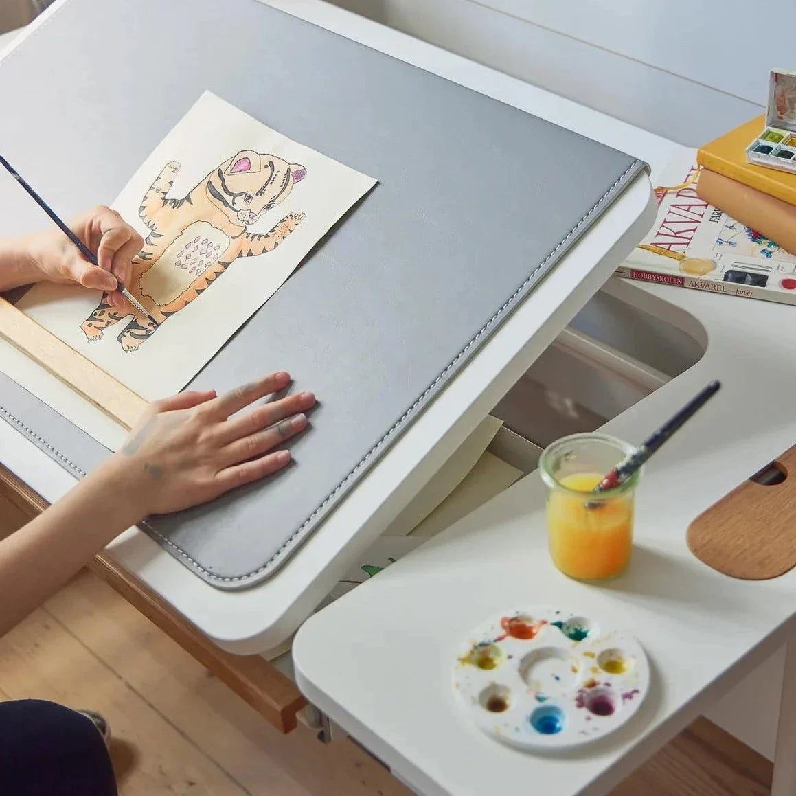 Moby barnskrivbord med delad skiva, lutbar skiva och justerbar höjd från serien Study från Flexa.