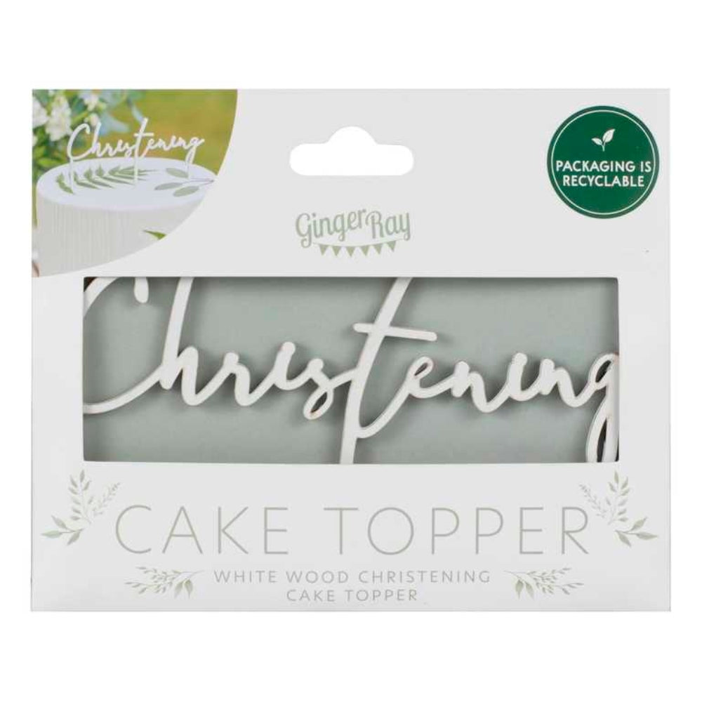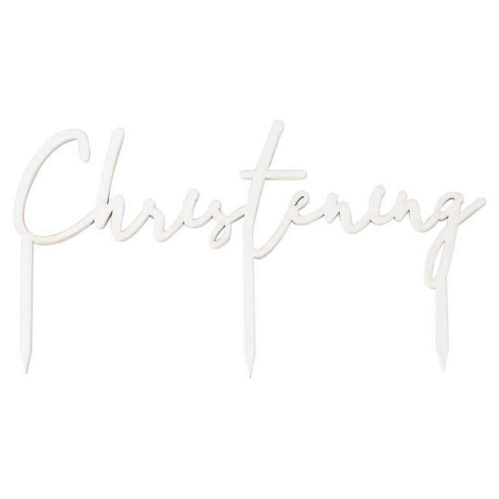Cake topper i vitt med ordet Christening.